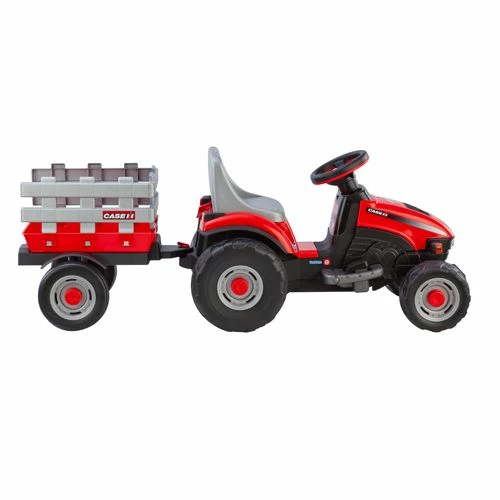 Peg Perego Case IH Lil Tractor & Trailer Rechargeable Tractor operates at 2¼ mph indoors or outside on smooth level grass dirt or paved surface and it has with automatic brakes when they lift their foot from the accelerator. Seat adjusts for growing legs. There is a stake-side trailer attached. 6-volt rechargeable battery and charger included. Made in USA using domestic and global components.