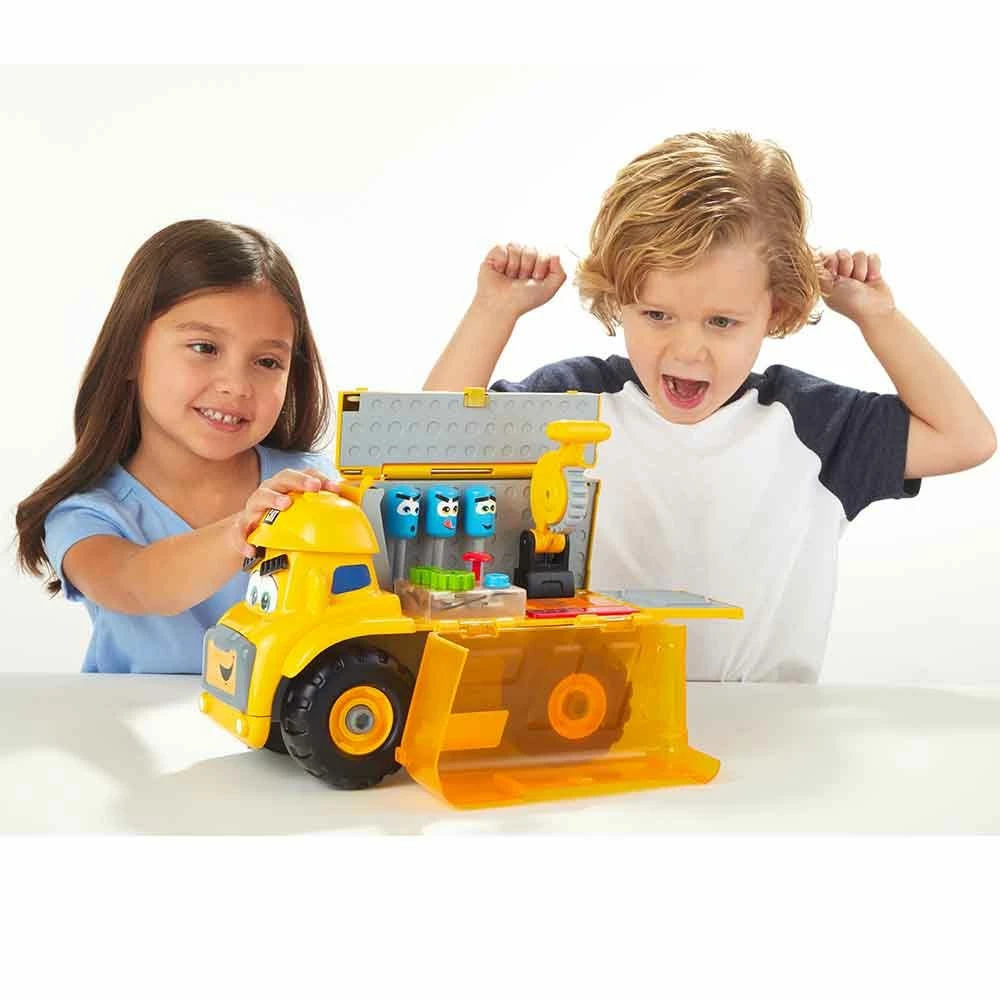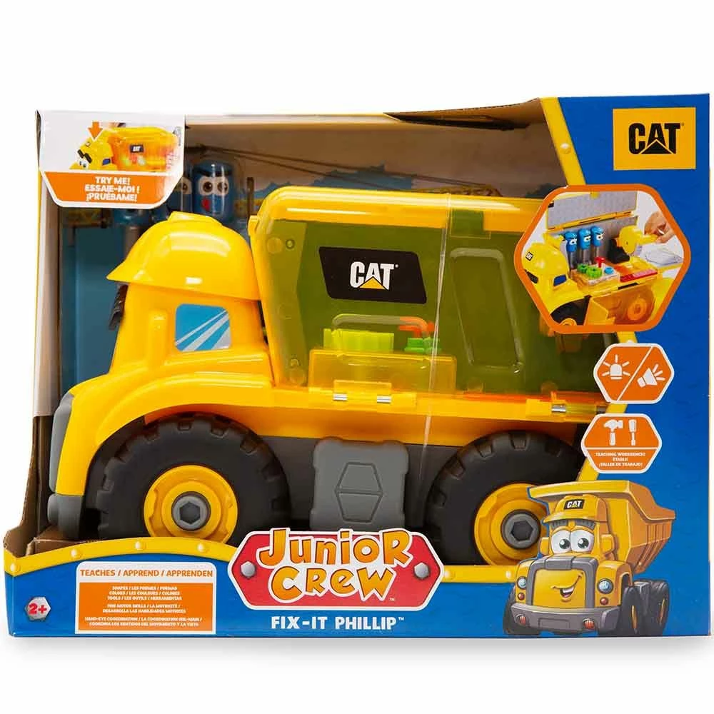 The chunky preschool friendly Fix-It Phillip is a large 12 in. vehicle filled with personality and designed to make learning fun and easy for young ones! Driving to the job site will animate Phillip’s face and bring a smile to your little ones. Transform the vehicle into an immersive teaching tool bench packed with fun with a push of the helmet. Your child will develop their fine motor skills and hand eye coordination as they interact with the friendly tool pals included. With a magnet safely secured inside the tools they can be moved around and stored on the magnetic pegboard until they’re needed for action. Each tool has a unique shape and specific purpose which when matched to its corresponding part on the bench activates different lights and Kid-Vroom Sounds™ to let your child know they’ve completed the task successfully. Even the large wheels are fully removable for fixing a flat or creating a stationary workplace. When playtime is over cleanup is a snap, simply place all the tools back onto the pegboard and close up the vehicle for convenient storage. Real CAT machines are known for their high quality, these toys are no different, built to withstand the tough demands of rugged play these vehicles will be your child’s go-to toy. Appropriate for ages 2 and up.