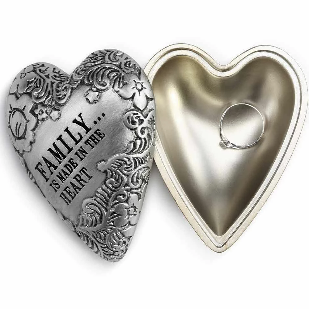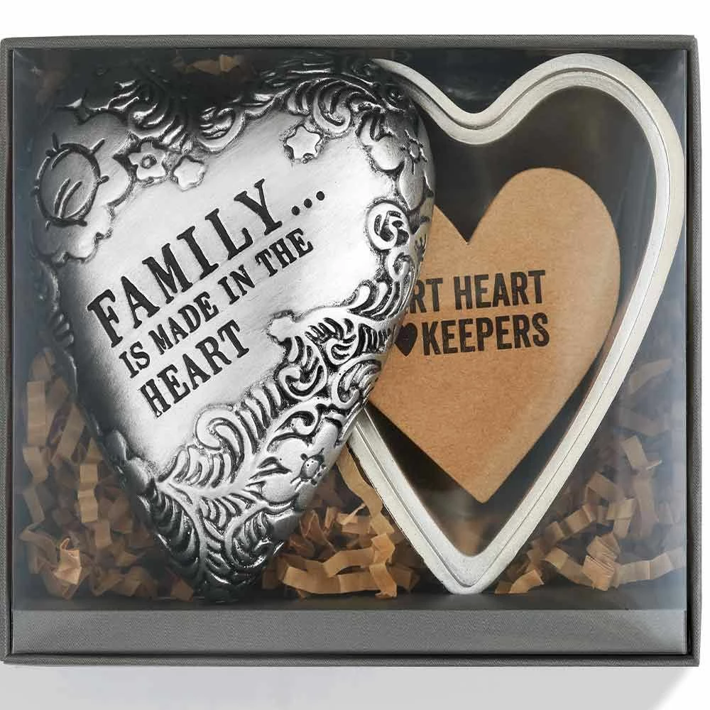 This Demdaco Family Art Heart Keeper box decoratively houses nostalgic keepsakes close to the heart .Open your heart to reveal a sacred hiding space for mementos. Gold foil, gift-ready packaging shows off each heart’s unique artwork.