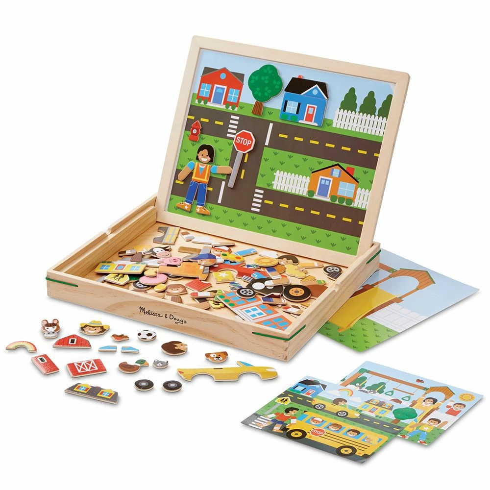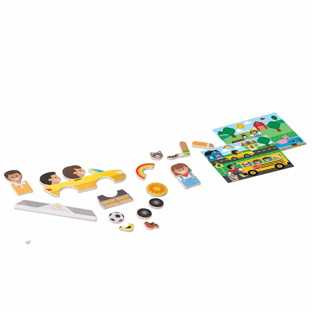 | Components and Accessories Included | 2 double-sided scene cards, 4 double-sided suggestion picture cards, 119 wooden magnets, wooden storage/travel case with lid/game board |