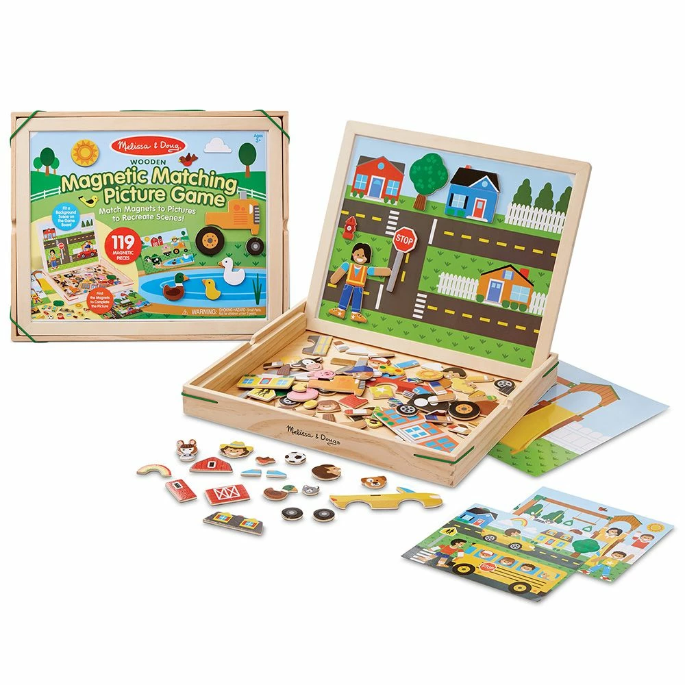 Combine more than 100 wooden magnets from the Melissa & Doug Magnetic Matching Picture Game to recreate and bring to life imaginative scenes! Fit a large background scene on the magnetic game board, choose one of the small suggestion cards with the same background, then find and place the magnets that match the suggested picture. The set includes 119 wooden magnets, 2 double-sided background cards, 4 double-sided suggestion cards, a magnetic game board that stands up in a sturdy wooden storage case with handle. Kids three and older will have fun while honing fine motor, matching, color recognition, and problem-solving skills!