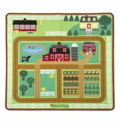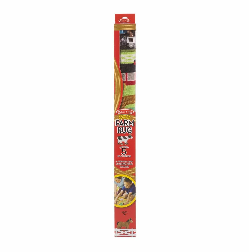 Melissa & Doug Round the Barnyard Farm Rug will have adventures cropping up all around the farm. This is a sturdy and colorful farm-themed play rug! Durably made to look great for countless playtimes to come, the soft, woven rug with a skid-proof backing comes with three flocked farm animal play figures (cow, pig, horse) and a wooden farm tractor and trailer, and features details like a barn, stables, farmhouse, chicken coop, pond, crops, garden, pasture, orchard, riding arena, trails, and more to give many options for creative play. Large format is big enough for multiple kids and lots of play pieces!