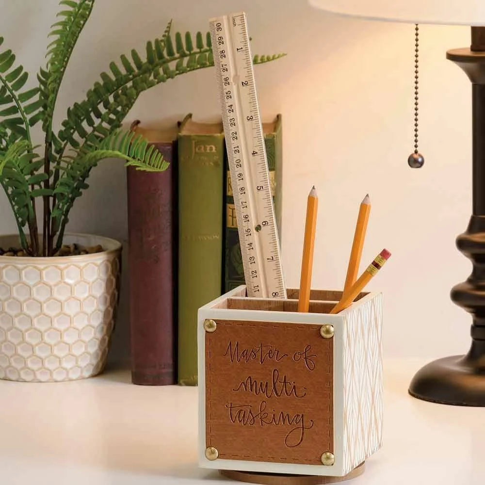 A wooden pencil spinner featuring debossed sides, a leather panel attached to the front with brass tacks, and hand lettered "Master Of Multi Tasking" sentiment. Pencil holder is divided in two even spaces.
