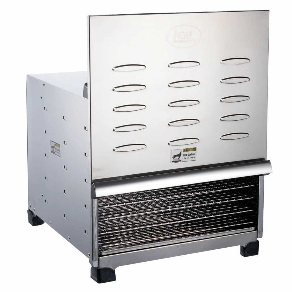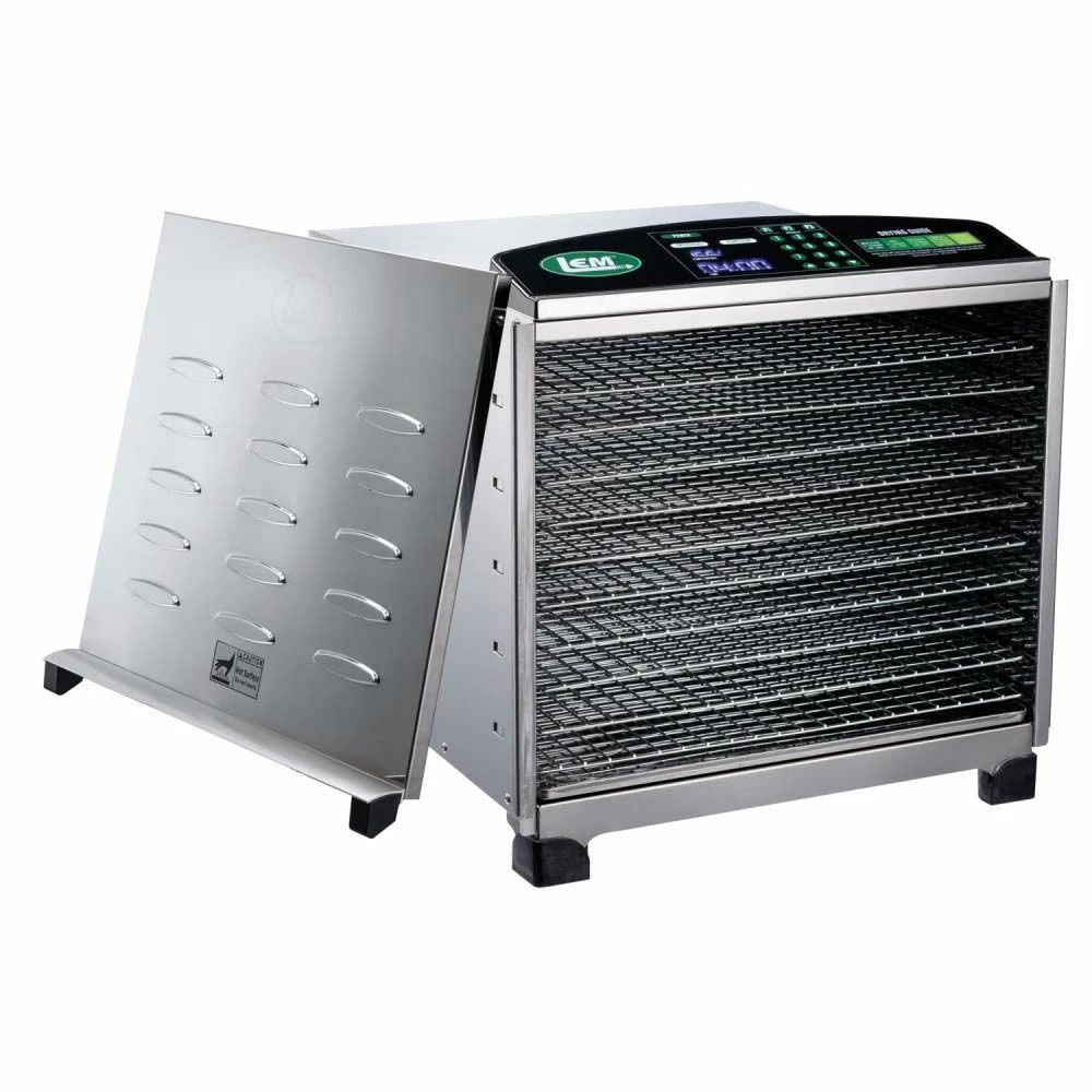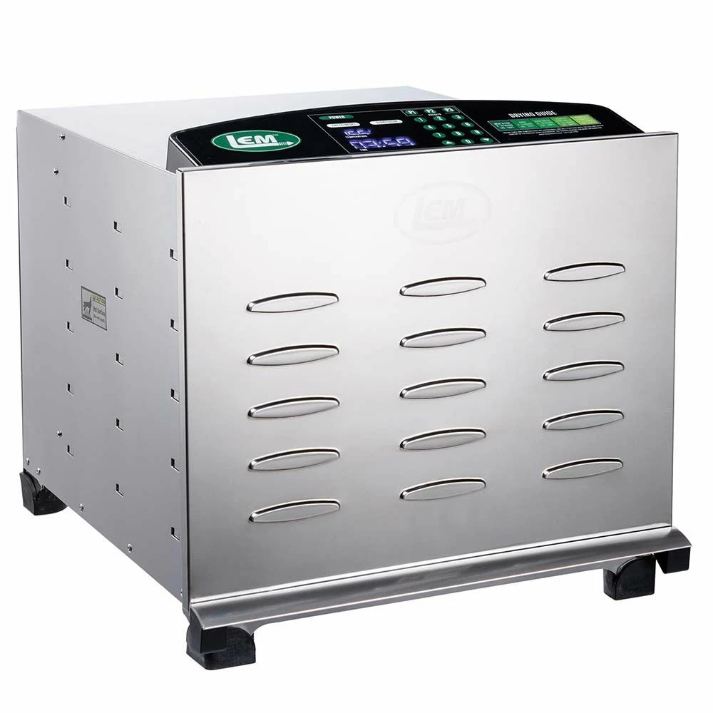 Make mountains of jerky, snack sticks, or other dried delicacies in a single sitting with the 16 square feet of drying space of the LEM Big Bite 10-Tray Digital Stainless Steel Dehydrator. Whisper Quiet Rear-Mounted Drying: The horizontal air flow design is powered by a whisper quiet rear mounted 770 watt fan and heating system for uniform drying. Hold in Place Door: Our Patented Magnetic Front Panel slides and locks in place so you can monitor progress with minimal heat loss. Digital Display: This high capacity dehydrator has an easy-to-reach digital display making it simple to set and read time & temperature. The digital display lets you choose between 3 customizable preset temperature controls as well. There is a heavy duty, easy to clean stainless steel housing with front and rear venting.
