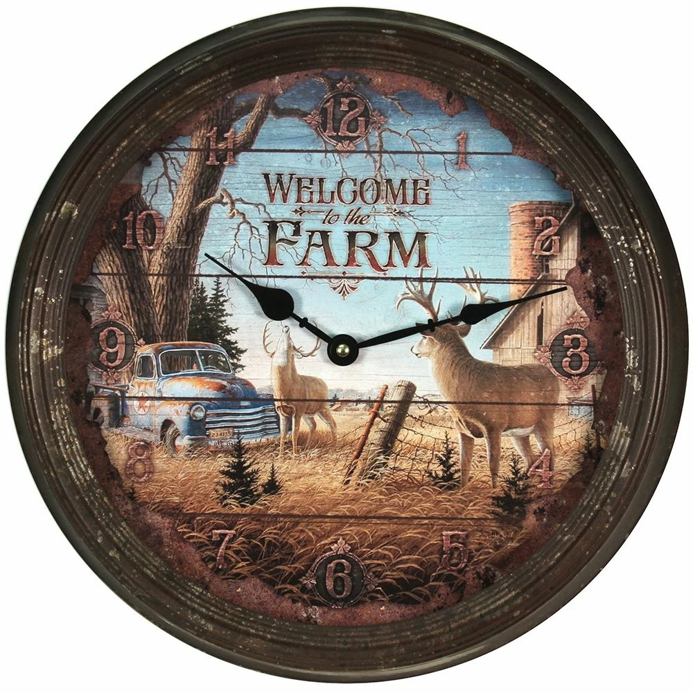 This Round Wall Clock from River’s Edge Products is designed with a distressed finish to embrace a cozy, outdoors theme. This clock measures 15 inches in diameter with its tin frame. The frame is designed to appear rusted. The clock face is covered with protective glass and features an illustration of two deer on a farm with the message Welcome to the Farm. The numbers are easy to read and run along the clock face’s border. This clock operates on 1 AA battery, which is not included. Add this clock to your home to enhance its relaxed and outdoorsy atmosphere. Relax and let this Round Wall Clock keep the time in your home.