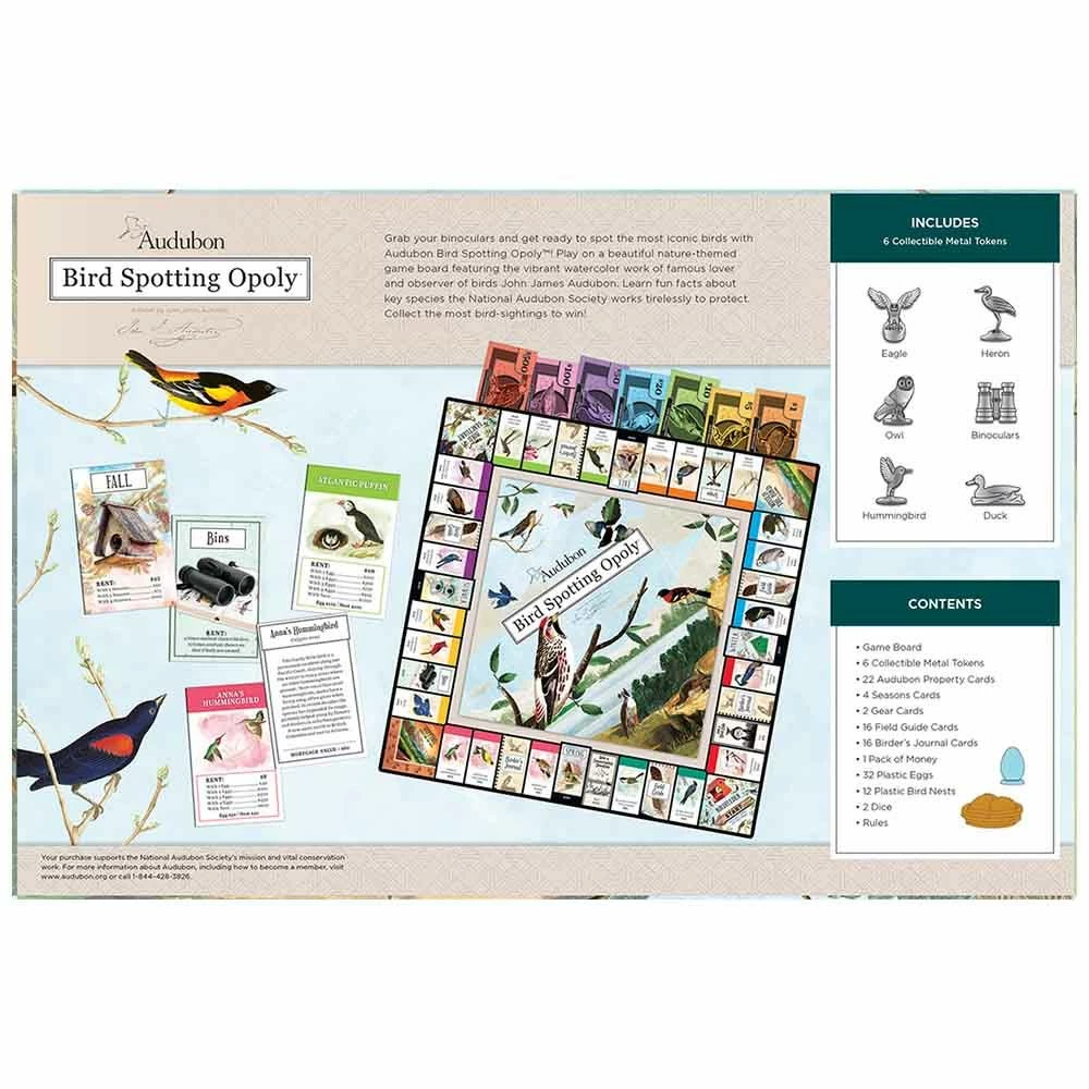 Grab your binoculars and get ready to spot the colorfully painted birds of John J. Audubon, the famous lover and observer of birds, with Audubon-Opoly! Play on a nature-themed game board to collect Audubon’s most iconic North American species. This game comes with 6 customer pewter pieces, 22 Audubon Property Cards, 4 Seasons Cards, 2 Gear Cards, 16 Field Guide Cards, 16 Birder’s Journal Cards, a packet of money, 32 eggs, 12 nests, 2 dice, and game instructions. Each of the cards comes with unique trivia. Collect the most bird-sightings to win!