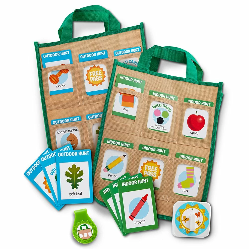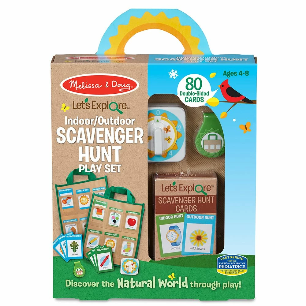 Explore the outdoors and more while discovering the thrill of the classic seek-and-find game with the Melissa & Doug Let’s Explore™ Indoor/Outdoor Scavenger Hunt Play Set! Explore the yard, the park, the playground, and more with the Outdoor version, or hunt for everyday items right at home with the Indoor cards. Choose from 80 double-sided cards, grab one of two jumbo collection totes, set the 10-minute timer, then ready, set, explore! The play set also includes two reusable ID tags for the totes, and a collectible medallion. Let’s Explore™ encourages kids four and older to connect with the natural world through imaginative play. Discover the joy of outdoor adventures that instill curiosity and confidence while inspiring kids to say, “Let’s Explore™”!