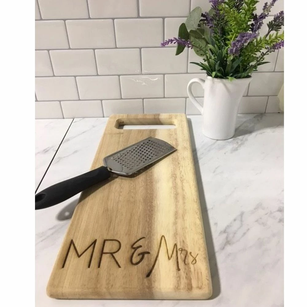 This cutting board by P. Graham Dunn is made of acacia wood and is laser engraved. Hand wash only.