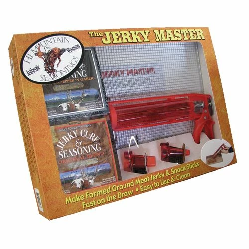 Hi-Mountain Jerky Master makes jerky or meat sticks out of ground meat. With the Jerky Master you are the master. It is as easy to use as 1, 2, 3 and cleaning is a snap with the newly designed cut-away handle. Kit is complete with jerky gun, one industrial grade jerky screen and two interchangeable nozzles for making strips or sticks.