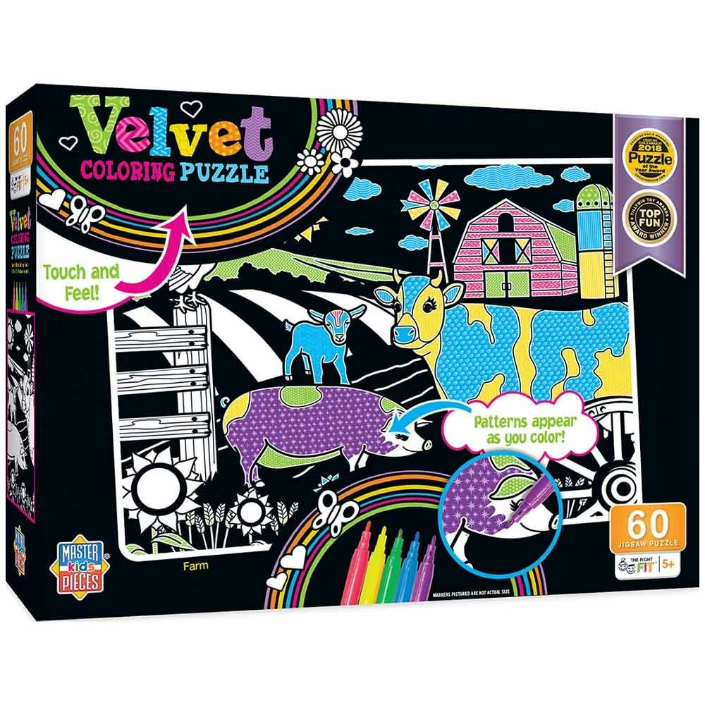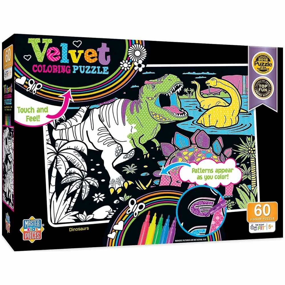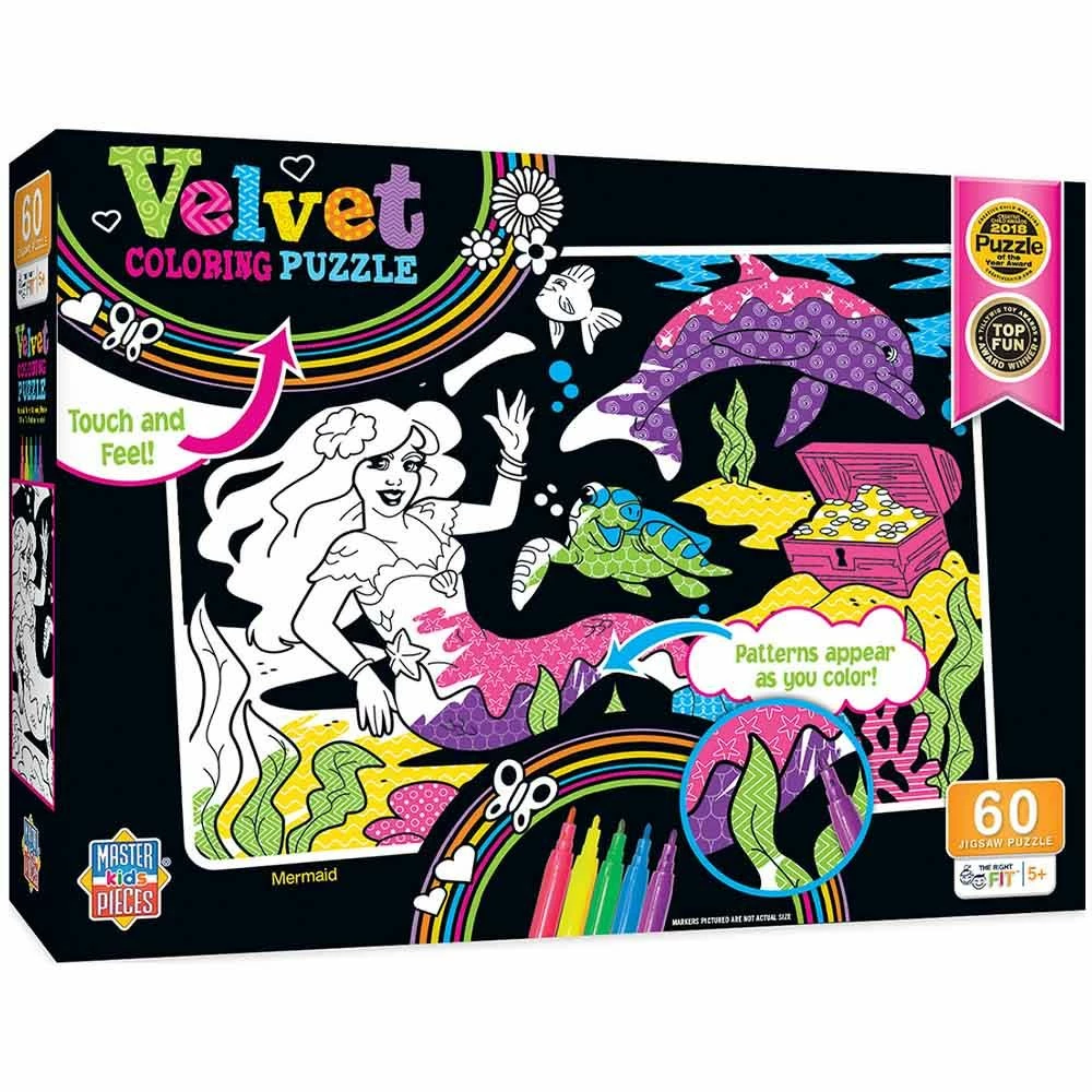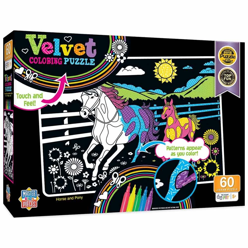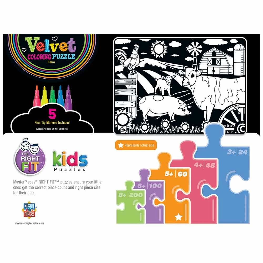 These Velvet Coloring puzzles bring together puzzling and coloring in this fun new activity for kids. Have fun piecing together the images. Once it is assembled get creative and use each of the 5 fine tip markers provided to make this image your own unique masterpiece. As you color, watch patterns appear in the image, like magic. This puzzle is 60 pieces and 19 inches x 14 inches in size. Look for The Right Fit® puzzles collection and make sure your little one gets the correct piece count and size for a good challenge for their age. This puzzle is the right fit for ages 5+.