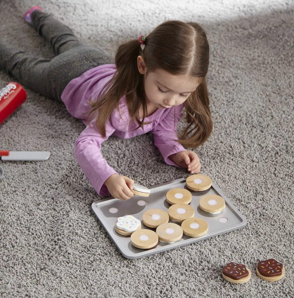 Melissa & Doug Slice and Bake Cookie Set lets your little one slice and "bake" a dozen wooden cookies for a sweet playtime treat! This colorful wooden set includes 12 wooden, sliceable cookies and 12 toppings, wooden knife, spatula, cookie sheet and a kitchen mitt for safe, deliciously imaginative play! The cookies store in a durable dough tube.