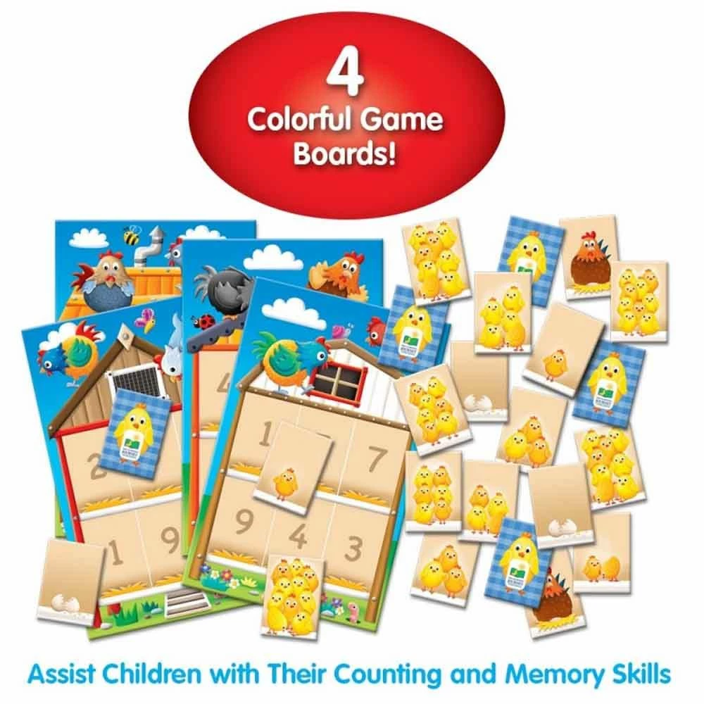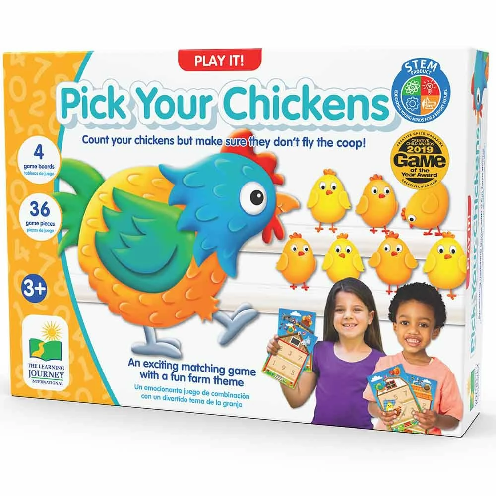 Play It! Pick Your Chickens by The Learning Journey will hatch laughter and cooperation skills when little players fill their chicken coop with chicks! Simply place all the chicken and egg cards face down on the table. Each player selects a game board and takes turns flipping over one card at a time. The player will try and match the number of chicks to the number found on the playing board. If the number of chickens matches the number on the playing board, place the correct card on the game board. If an egg is selected, remove one of the matched items from your board and place it face down again. Place the egg on the game board until it can be replaced with a correct number. Be the first one to match all 6 chickens to the numbers on their board to win the game! For up to four players. Ages 3+ years.