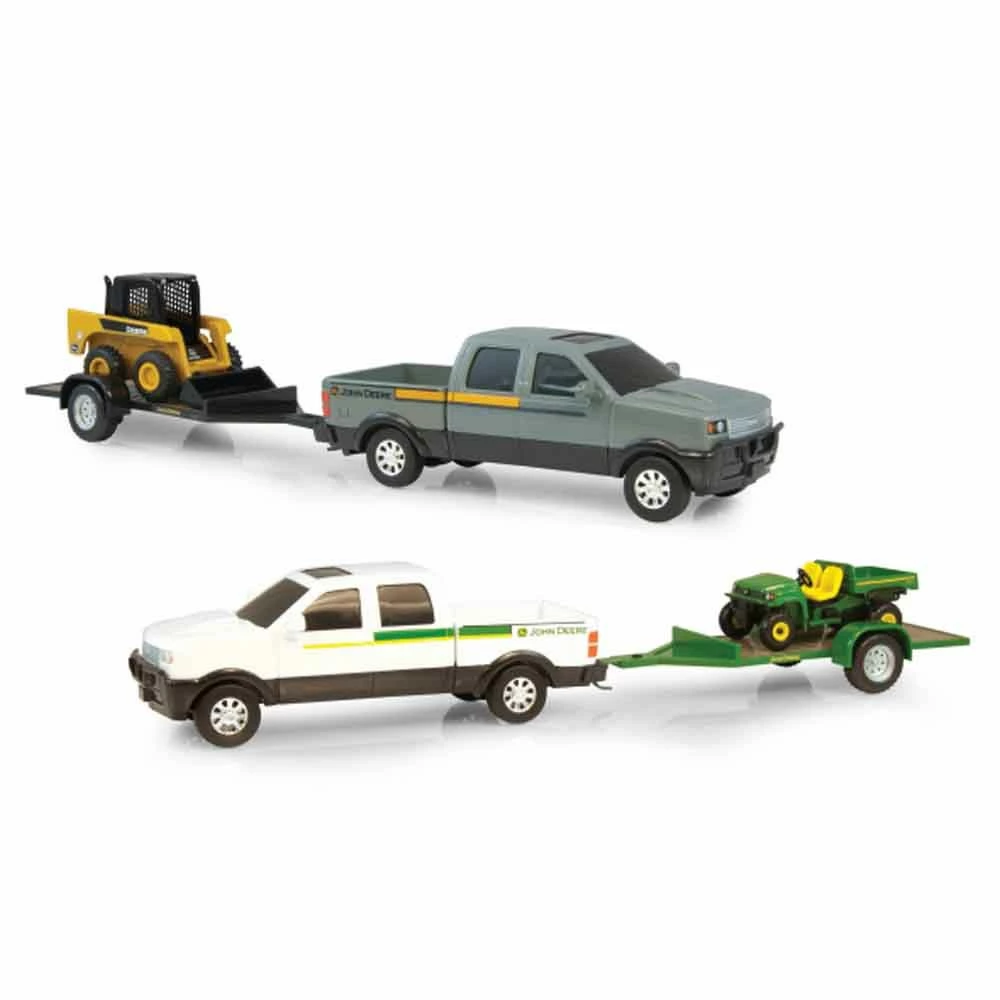 This John Deere Pickup Hauling Set assortment features two great sets. Each includes a John Deere pickup and a John Deere vehicle, either a skid loader or a gator, that fits easily on the included trailer. Durable die-cast and plastic construction is great for both indoor and outdoor play, and free rolling wheels make it easy for kids to have plenty of hauling fun.