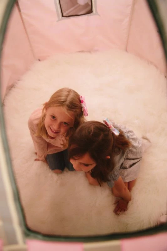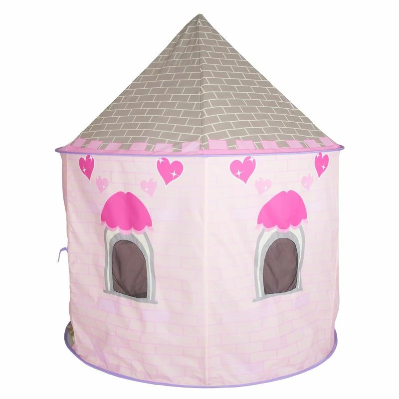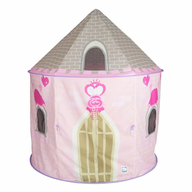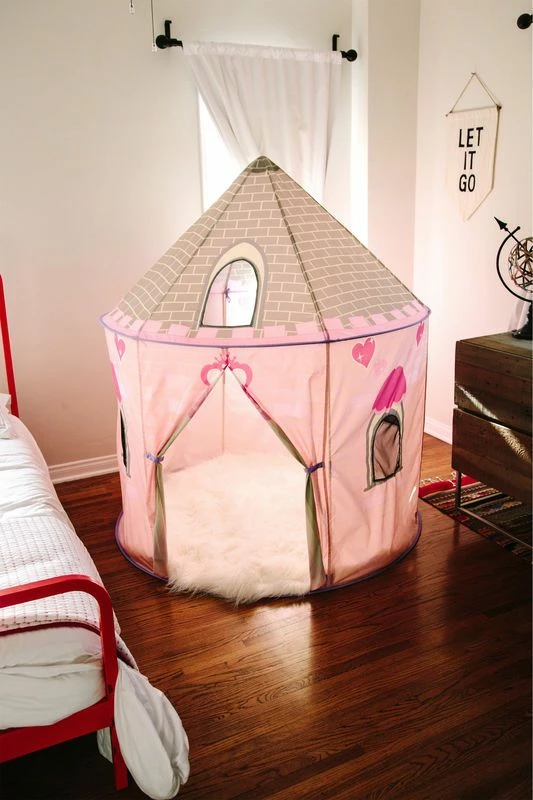 Pacific Play Tents® Princess Castle Pavilion provides the ultimate princess experience! Big enough for the whole neighborhood kids can play with all of their toys and stuffed animals put on a show play dress up and still have plenty of room left to dance. This unique hexagonal design and extra-large play area is easy to assemble and easy to clean. The Ultra-Mesh lets air in and keeps bugs out while the double stitch seams along the stress points provide reinforcement. The flaps roll up and the doors can be tide back with Velcro® tabs. The Super Poles™ are patented for safety and color-coated for fast and easy assembly. Reinforce pole pockets are for added durability. This play tent is made of peach skin. Fun for the whole family! No batteries or videos just hours of great imaginative fun play time.
