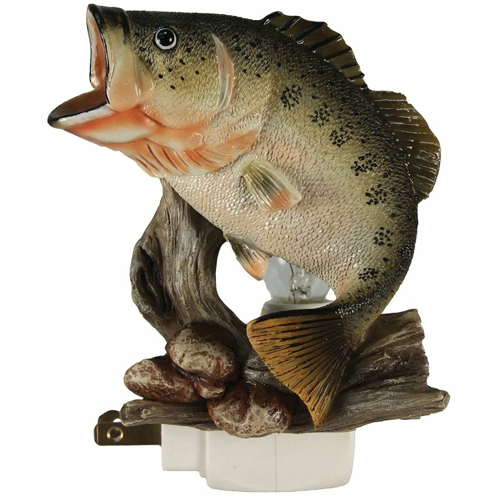 The 3D bass night light from River's Edge Products showcase a largemouth bass next to a piece of wood and rocks. Features an automatic on/off sensor, and fully adjustable rotating head. The rotating head is constructed of a durable hand painted poly resin with excellent attention to detail. The light operates on 120V AC and includes a bulb. The light is also UL approved. Light up any bedroom or bathroom in style. Makes for a perfect gift idea for any outdoor enthusiast.