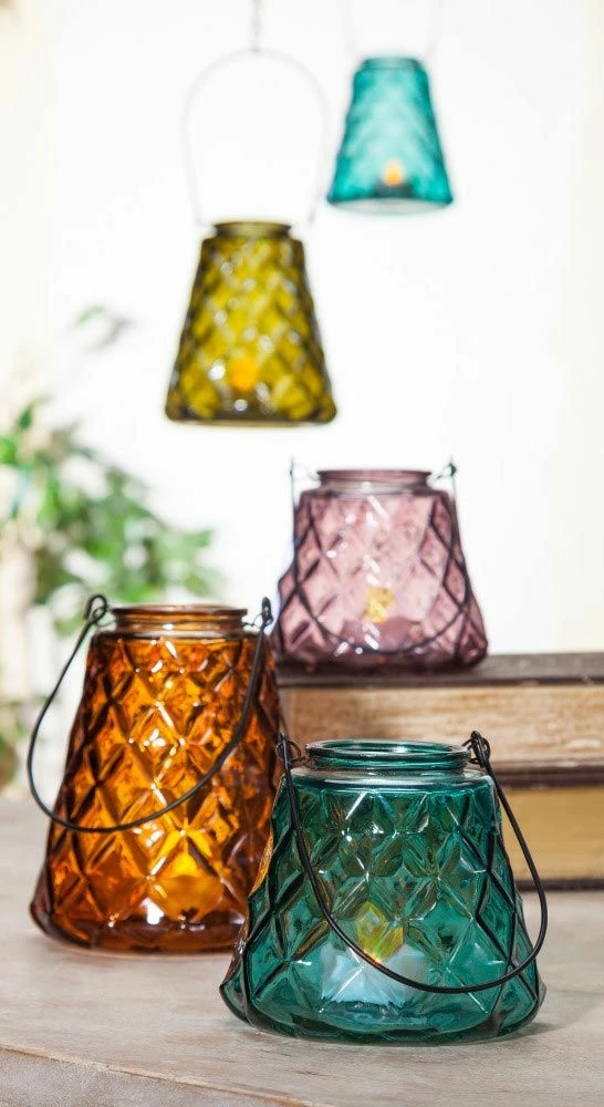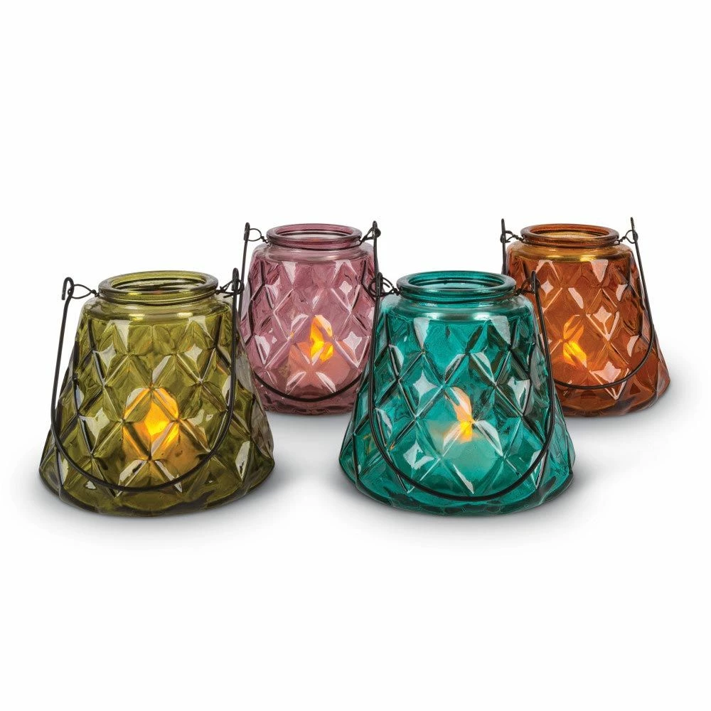 Lone Elm Studios Assorted Glass Votive Holders set of 4 allows simply decorate in your own unique style. Each of these beautiful and unique cups has diamond, artisanal ridges situated along the exterior and has a small, metal handle for hanging. These gorgeous cups come in 4 assorted spice market colors: green, purple, red and blue and are intended for use with flameless, battery-operated candles only (not included). Intended for indoor use only, these beautiful votive candle holders make for the perfect house-warming gift for that special someone or to simply enhance and accentuate your own personal style and taste in decor.
