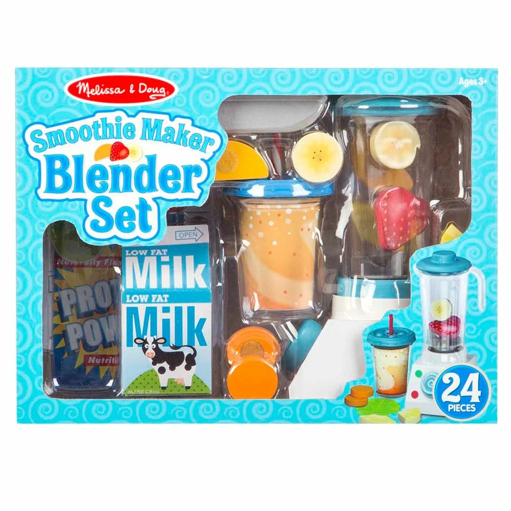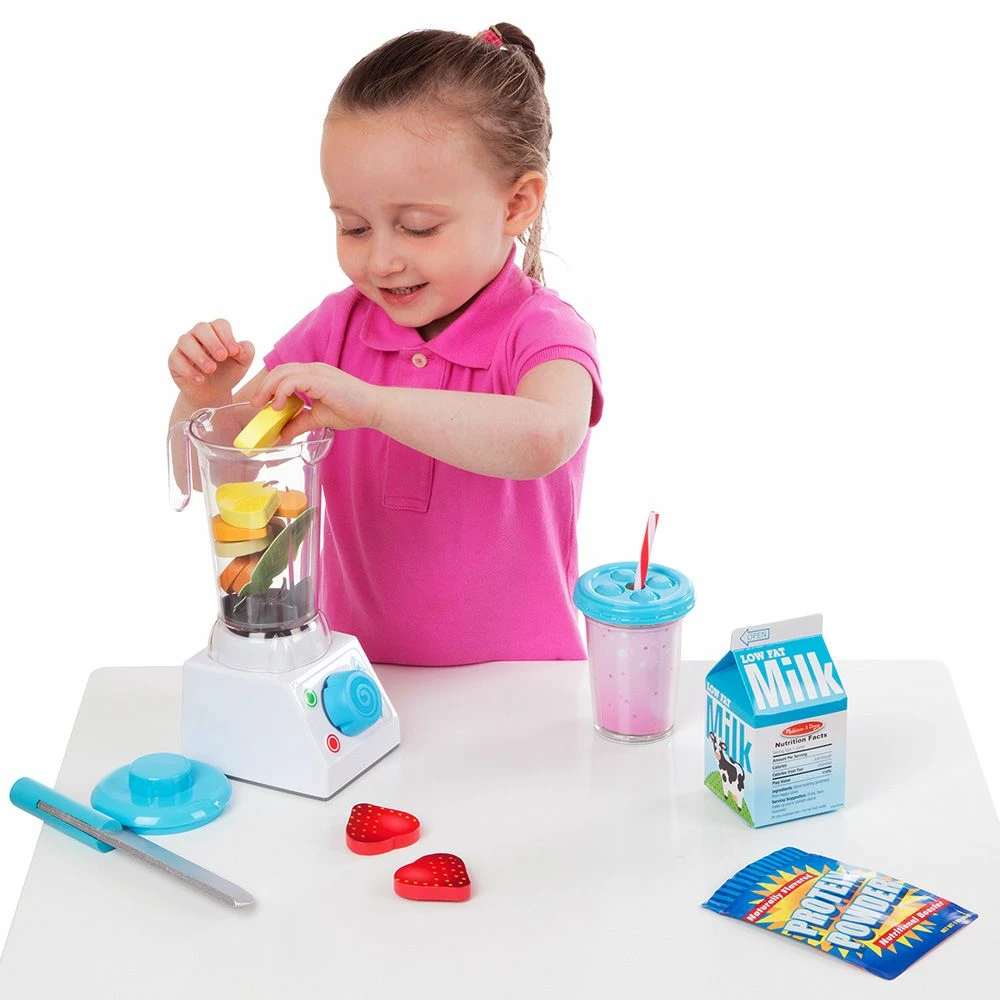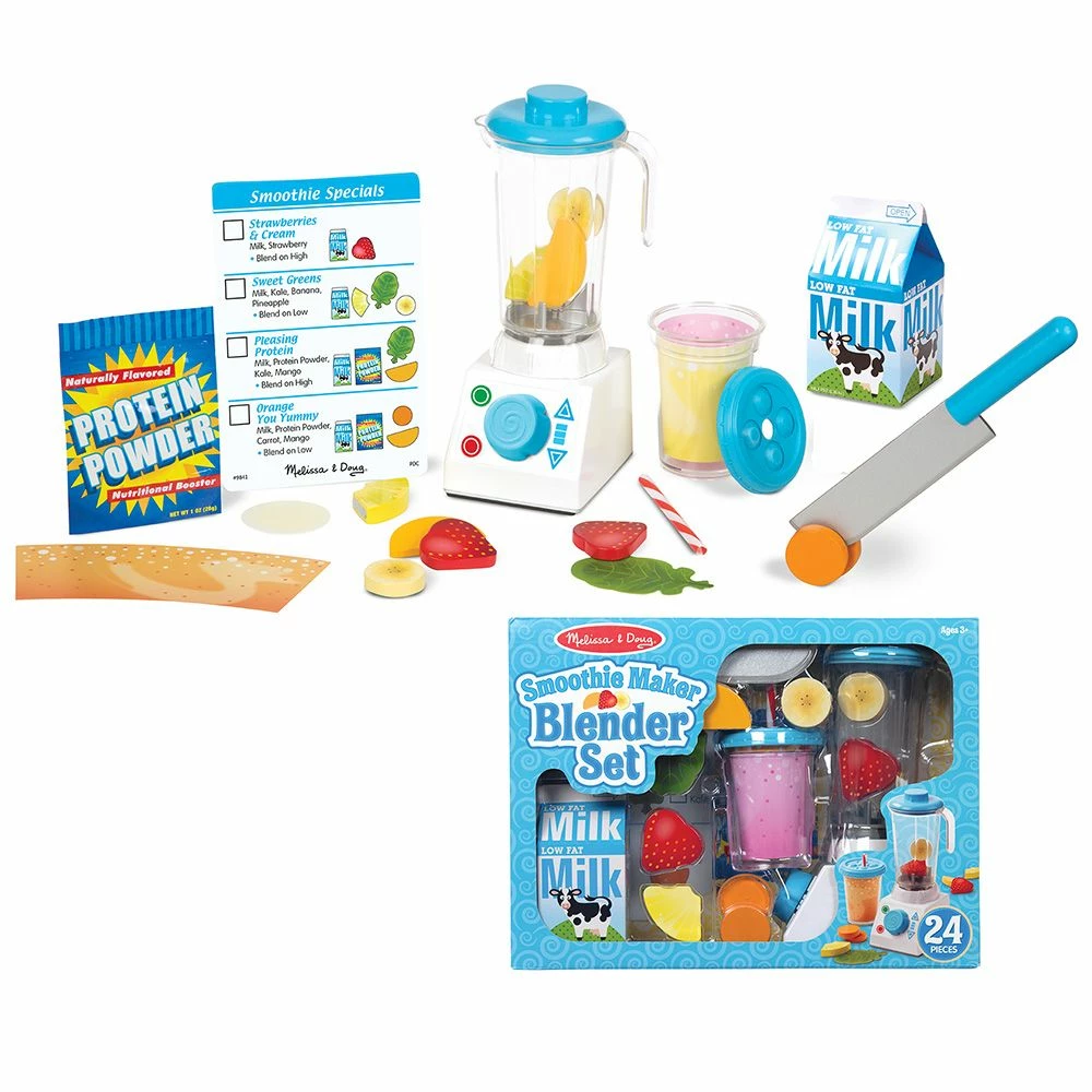 Whip up delicious playtime smoothies with this pretend play Melissa & Doug Maker Blender Set! Use the wooden knife to slice and wooden fruits and vegetables, choose other healthful ingredients, like kale or protein powder, and pop them in the blender. Add a dash of pretend milk, spin the dial to blend, pour into a cup with lid and straw, and serve! There’s a double-sided reusable menu card for taking orders, and cup inserts to add realistic color to smoothies. Any time is a good time for a smoothie!