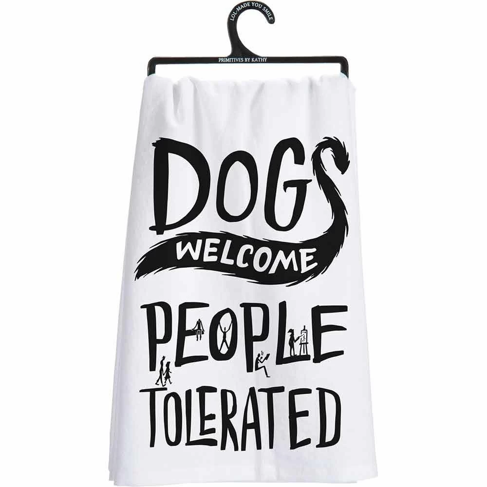 A cotton dish towel lending "Dogs Welcome – People Tolerated" hand lettered sentiment with furry letters and character designs that complements well with existing kitchen decor. Machine-washable.