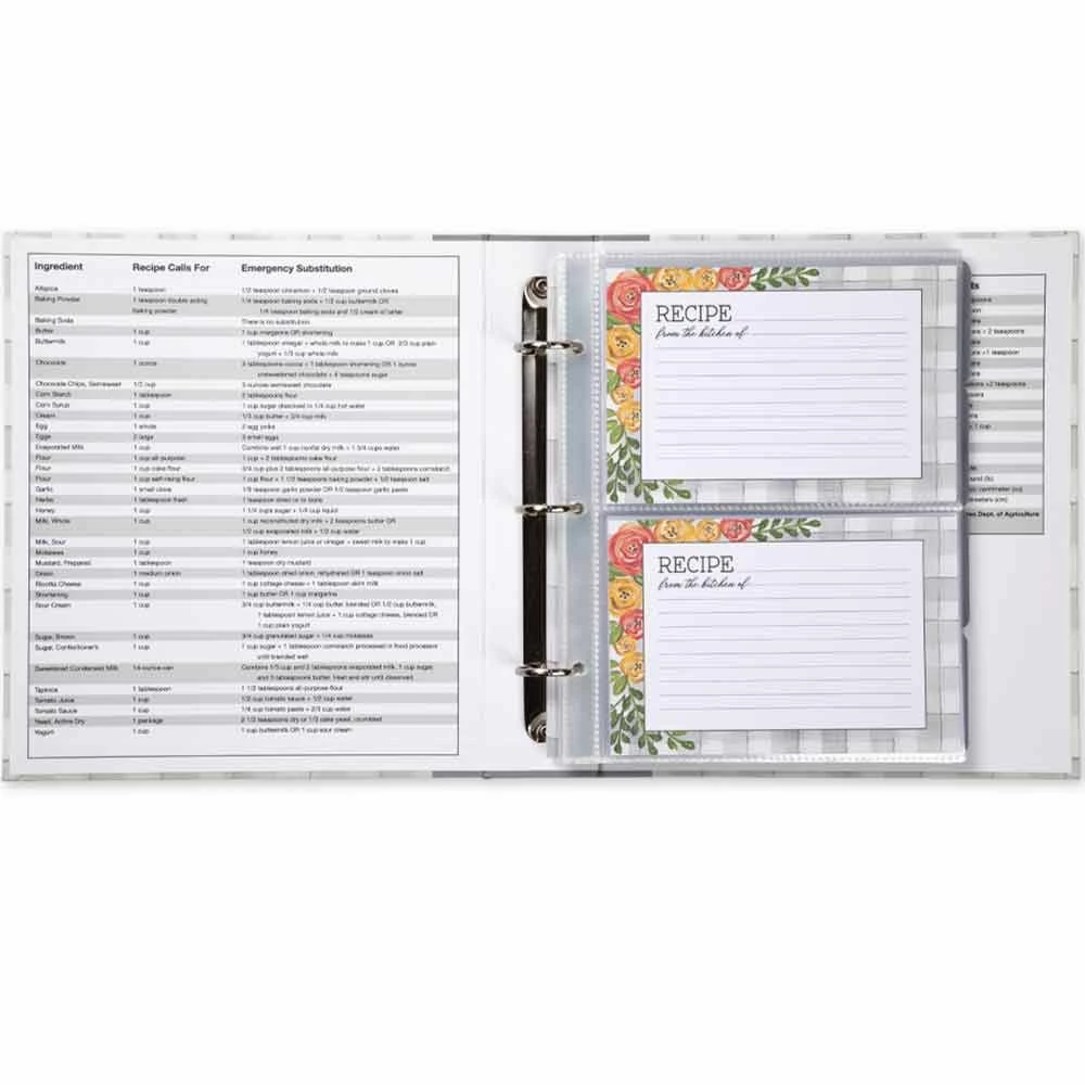 This Vintage Floral recipe binder featuring chic vintage style is the perfect place to store all of your favorite recipes. The artwork features leafy floral garlands on a gray & white check background. This three-ring binder includes 20 clear 8 x 6 in. acrylic sheets to hold your recipe cards and protect them from kitchen splatter. Each acrylic sheet holds up to four recipe cards. Forty cardstock 4 x 6 in. recipe cards with matching artwork and lines on the front are also included with this binder. Twelve coordinating dividers can be found inside the binder to help you organize all your recipes by types. Fill this binder with your family and favorite recipes to pass down through generations. The perfect way to create a family treasure of recipes! This item is a 8 x 9 in. 3-Ring recipe binder with 20 Clear 8 x 6 in. acrylic sheets with compartments for four recipe cards. 40 cardstock 4 x 6 in. recipe cards with coordinating artwork and lines on the front. Twelve Recipe Dividers are included with the same type of artwork.