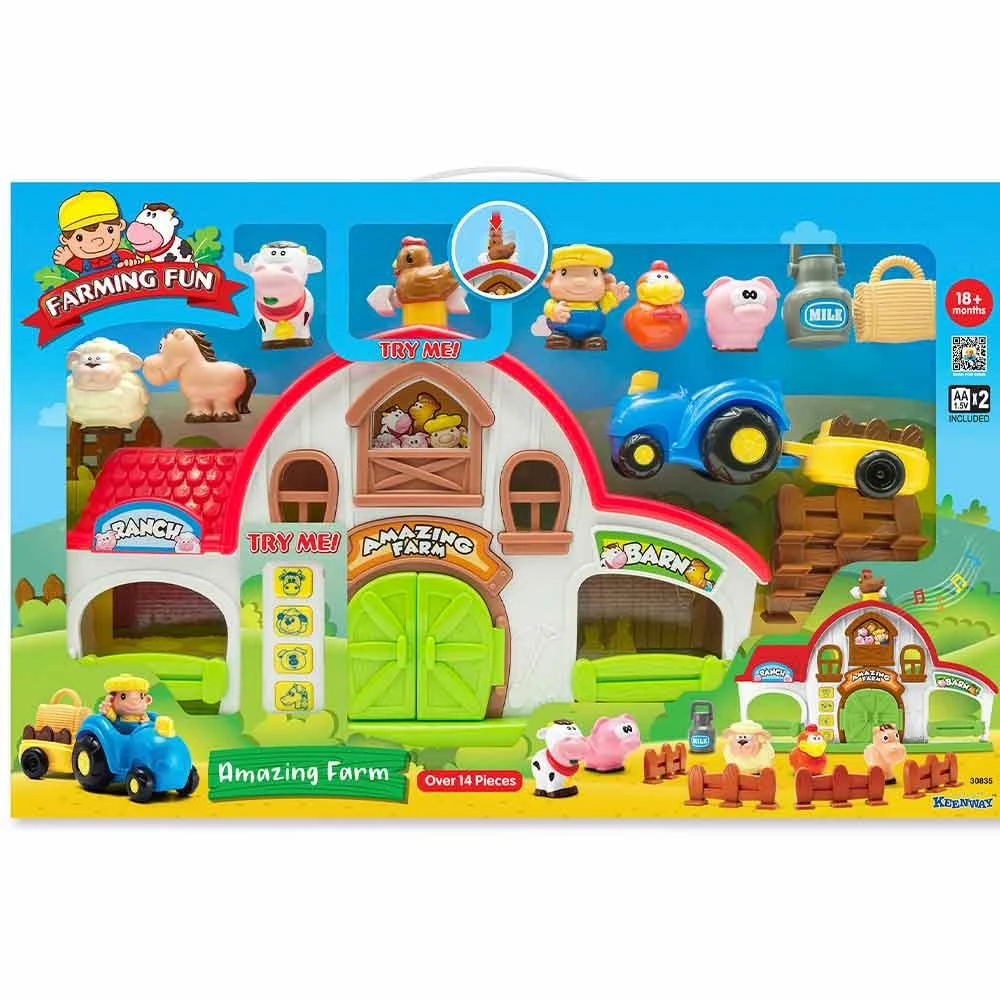 Amazing Farm set complete with toy figures of a farmer, cow, horse, pig, sheep, and rooster. Also included is a tractor, trailer, and many other farm related components. Huge farm house features sound effects and mechanical functions.