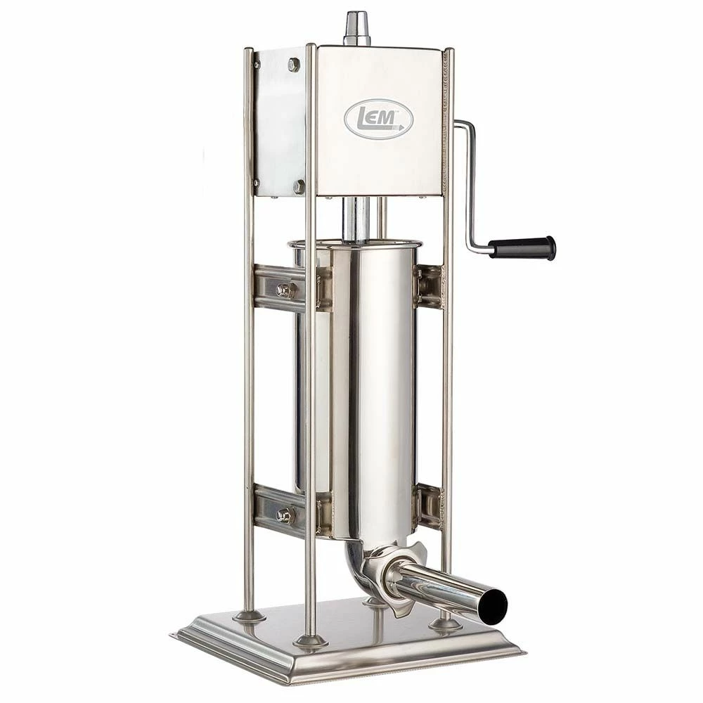 LEM Big Bite Dual Gear Vertical Stuffer 10 Lb. with 2 Speeds features a "90 degree" handle that gives you excellent leverage and makes cranking easier than ever. The huge drive gear, notched piston rod and all metal gears are built to deliver and withstand the pressure needed to stuff even small sausages. Four solid stainless steel bars create a sturdy frame that won't bend or bow under pressure. The unique two-speed design allows a high speed to raise the piston quickly for filling the cylinder and the low speed for stuffing casings. An air release valve in the piston ensures even pressure and better results, while the heavy-duty rubber gasket seals the cylinder to prevent leaks. Stainless cylinder is removable for easy filling and cleaning. It can be mounted to a table for easy filling by using the pre drilled holes- mounting hardware is not included. It is not recommended for snack sticks.