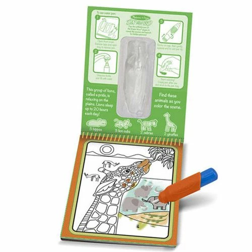 Melissa & Doug Water WOW Safari Water Reveal Pad is no-mess painting for kids! This exciting paint-with-water coloring book includes four reusable pages and a refillable water pen. Simply use the pen to color in each scene–details and vibrant color appear with every stroke! Then let the page dry to erase the pictures and fill it in again and again. This safari-themed book includes four scenes to color, and a search-and-find activity for each scene. The chunky-sized water pen is easy for kids to hold and stores neatly right in the front cover, so Water WOW! books make ideal travel activity books and travel toys for kids.