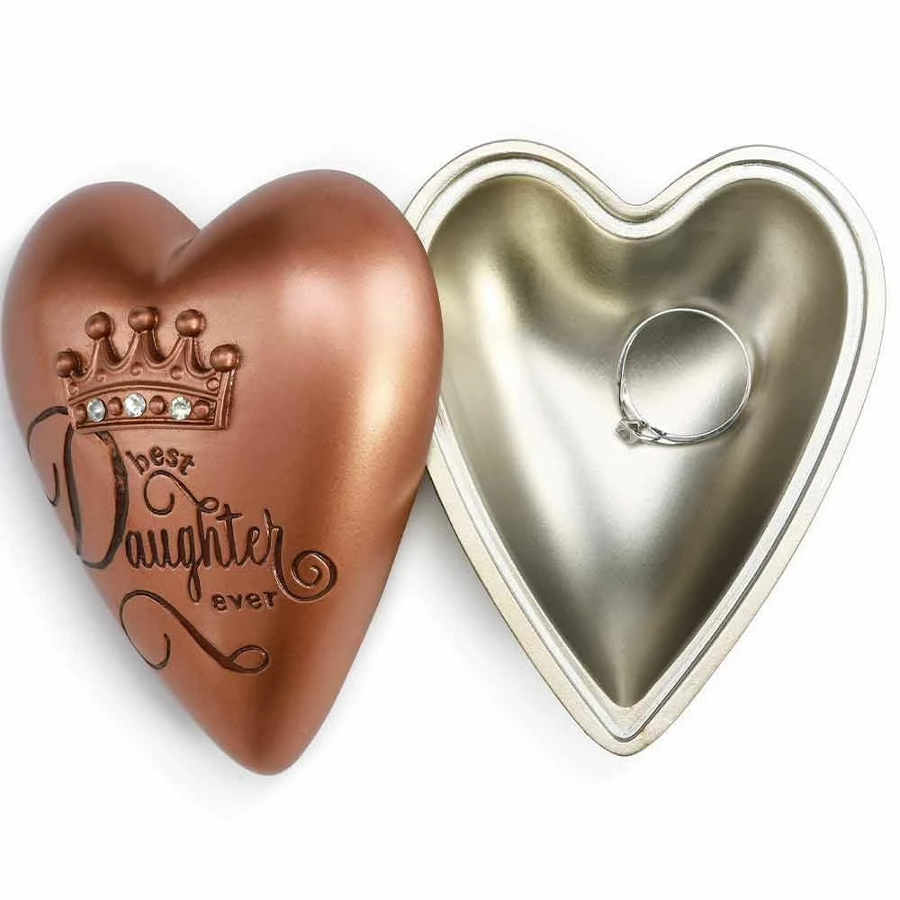This Demdaco Daughter Art Heart Keeper box decoratively houses nostalgic keepsakes close to the heart .Open your heart to reveal a sacred hiding space for mementos. Gold foil, gift-ready packaging shows off each heart’s unique artwork.