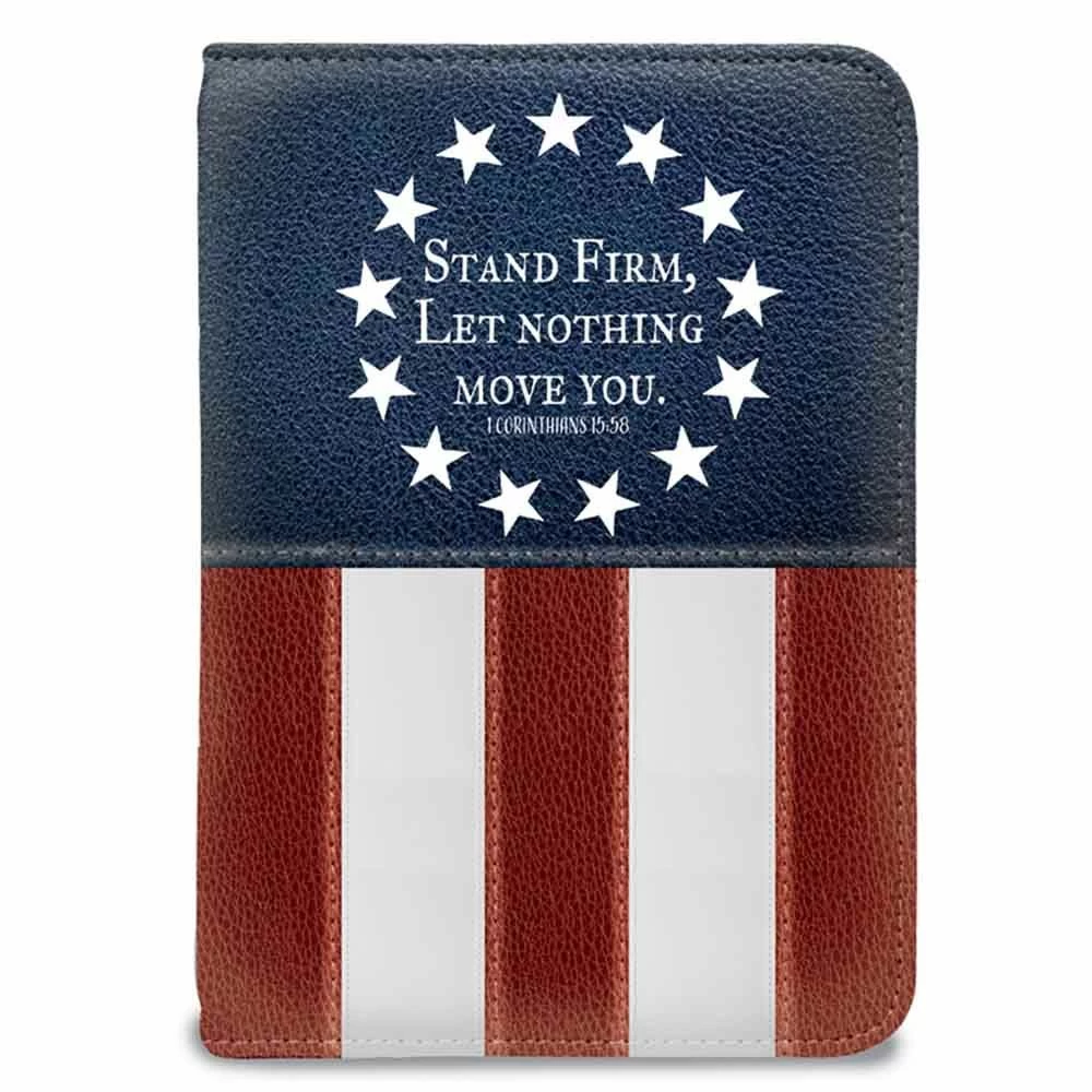 Divinity Boutique Stand Firm Zippered Faux Leather Journal. It includes 160 lined pages with 4 color patriotic inner spreads with scripture on each page. The text on the front cover says "Stand Firm, Let Nothing Move You." I Corinthians 15:58.