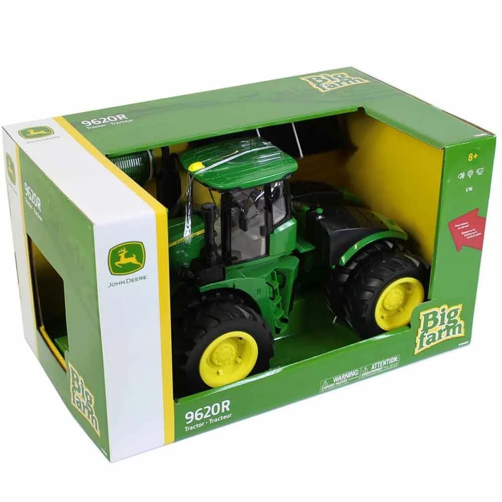 This John Deere 9620R features the traditional Big Farm lights and sounds. It also features an articulated body, removable duals, and interchangeable front weights and a front blade. Requires 3-AAA batteries – included.