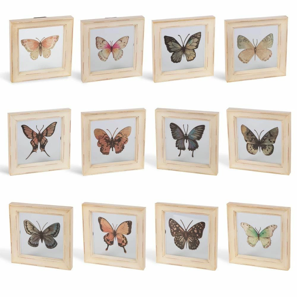 This beautiful set of 12 Lone Elm Studios Framed Butterfly Wall Art pictures will add the perfect touch to your own distinct decorative theme. Each wooden-framed picture features a unique, realistic-looking, metallic butterfly in different colors on a white background, each behind a protective glass pane. The frames are artfully-constructed of fir wood and accented in antique-style white. Arrange them together or separately to suit your own personal tastes. For indoor use only, each of these gorgeous framed butterfly pictures is 6.3-inches long and would make for an excellent house-warming gift for that special someone or to tastefully decorate your own home.