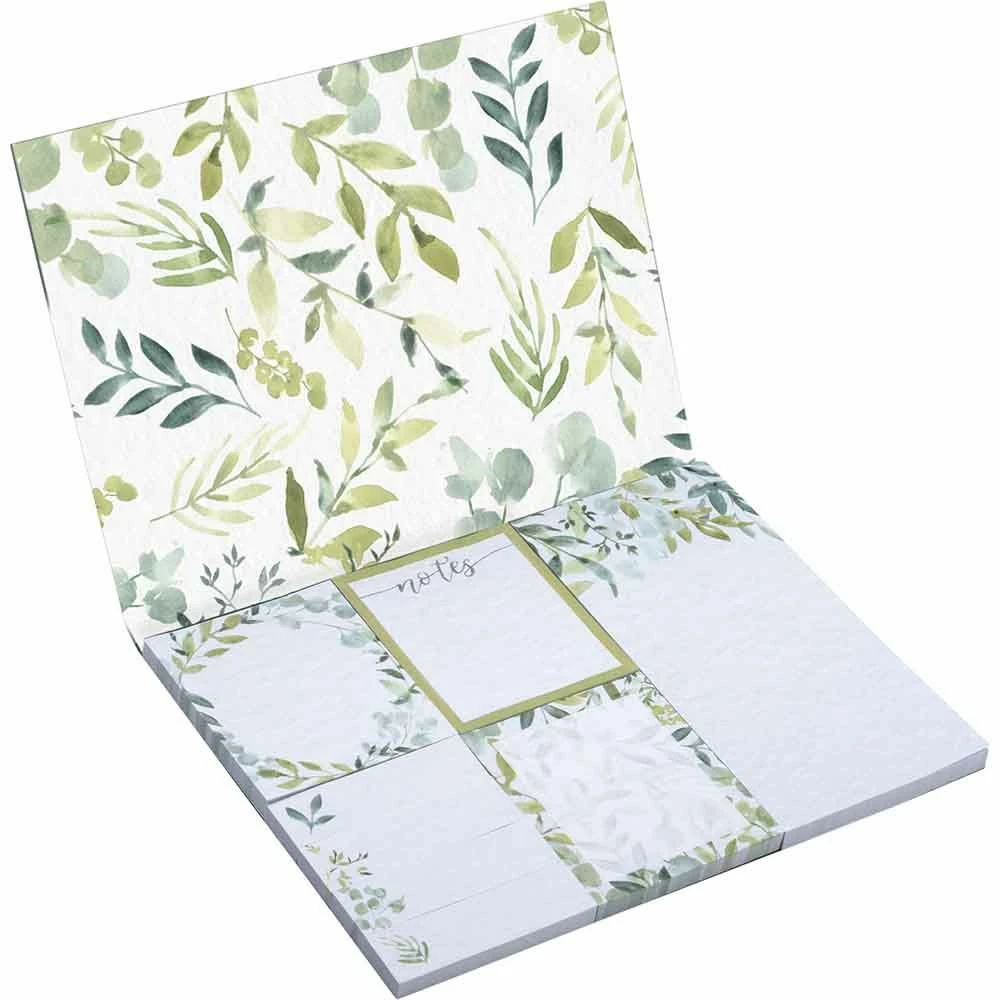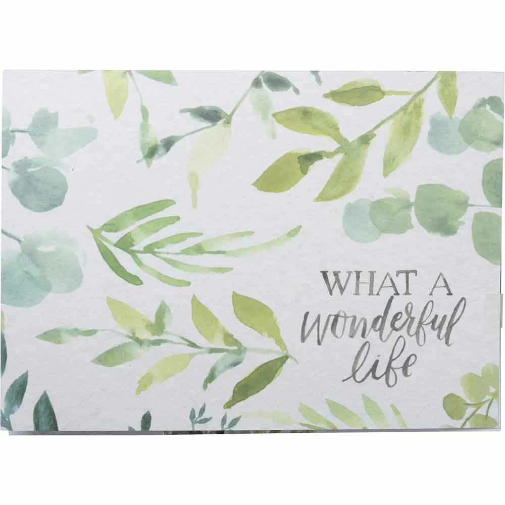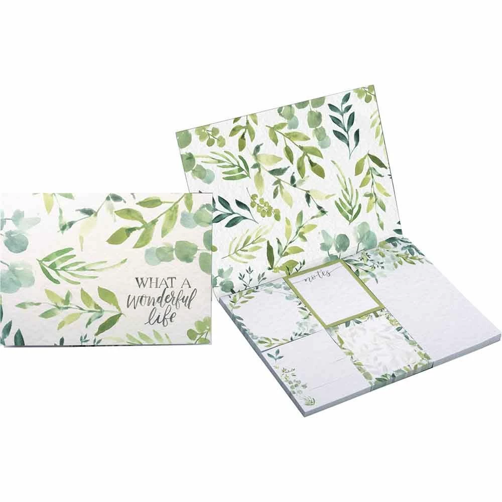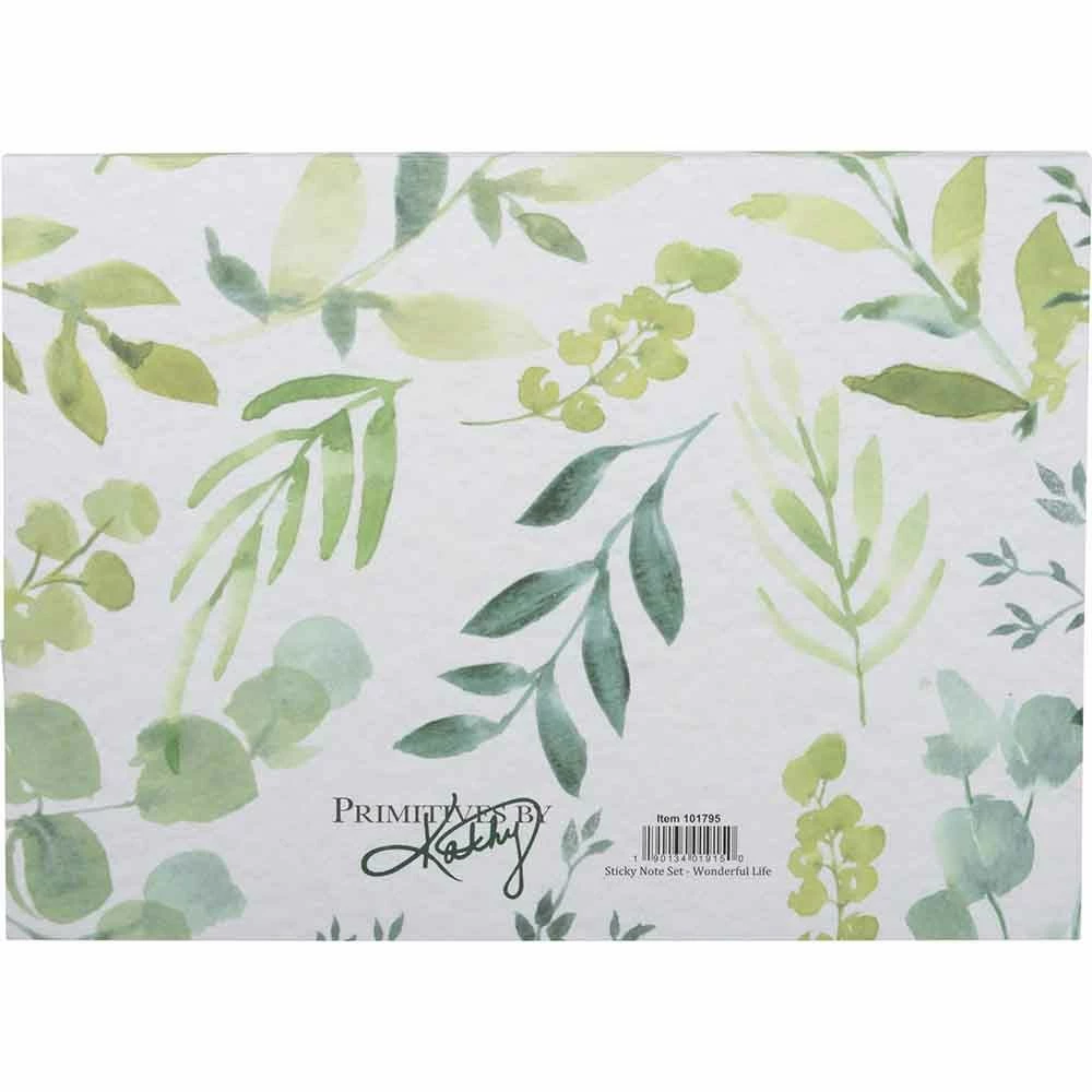 Primitive by Kathy gift, a sticky note set featuring watercolor artwork, "What A Wonderful Life" top lid sentiment, and botanical designs in a cool green palette. Contains a total of 480 sticky notes in varying sizes. Complements well with coordinating pieces in collection for a refreshing spring display.