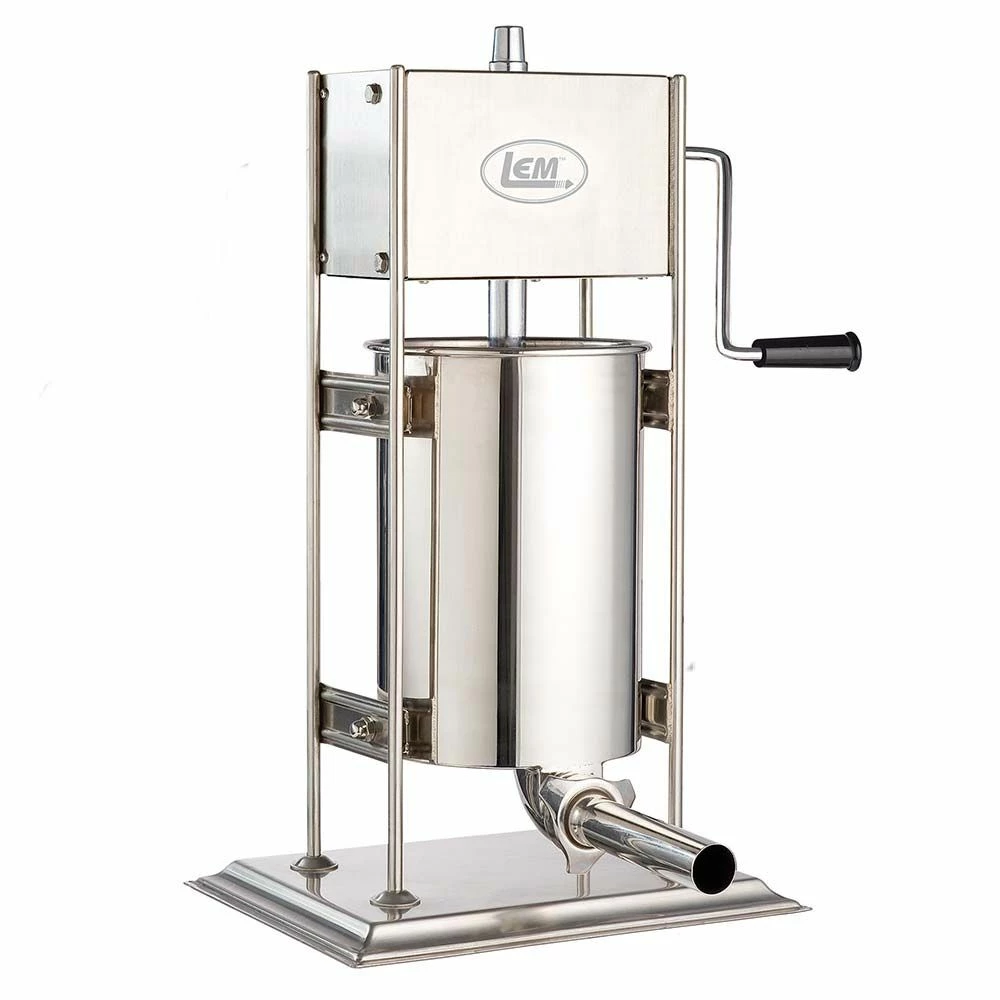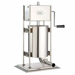 LEM Big Bite Dual Gear Vertical Stuffer 25 Lb. with 2 Speeds features a "90 degree" handle that gives you excellent leverage and makes cranking easier than ever. The huge drive gear, notched piston rod and all metal gears are built to deliver and withstand the pressure needed to stuff even small sausages. Four solid stainless steel bars create a sturdy frame that won't bend or bow under pressure. The unique two-speed design allows a high speed to raise the piston quickly for filling the cylinder and the low speed for stuffing casings. An air release valve in the piston ensures even pressure and better results, while the heavy-duty rubber gasket seals the cylinder to prevent leaks. Stainless cylinder is removable for easy filling and cleaning. It can be mounted to a table for easy filling by using the pre drilled holes- mounting hardware is not included. It is not recommended for snack sticks.
