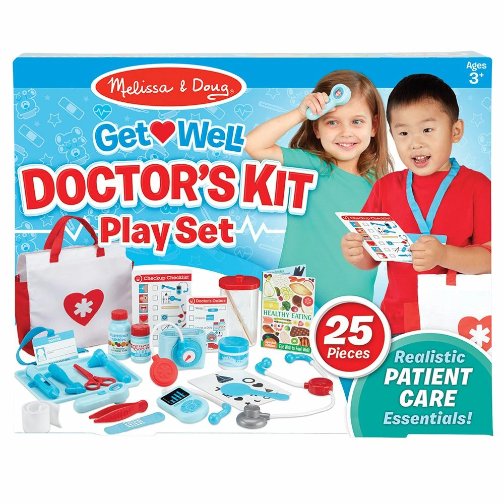 The doctor will see you now! The 25-piece Melissa & Doug Get Well Doctor’s Kit Play Set offers realistic accessories let little doctors help patients get well! Kids three and older can pretend to check temperature, heartbeat, blood pressure, eyesight, hearing, and more. There are play tools like a syringe, play scissors, and reflex hammer, as well as play bottles, and bandages for examining and treating patients. Reusable activity cards and fun details like an ID badge on a lanyard and a magazine for patients in the waiting room round out the doctor’s office experience. The play set is a fun and engaging way to ease any feelings of stress associated with a visit to the doctor and to encourage nurturing and empathetic play. Spark a child’s creativity and imagination, and inspire young healers for years to come!