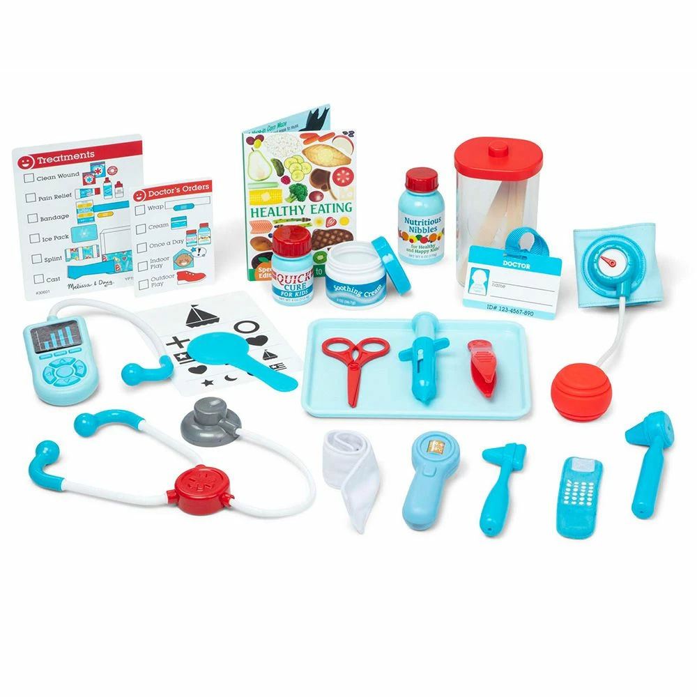 | Components and Accessories Included | Play stethoscope, blood pressure cuff, hearing tester, syringe, scissors, tweezers, rolling forehead thermometer, reflex hammer, otoscope, eye cover, tongue depressors bottles, ID badge, activity cards, and more |