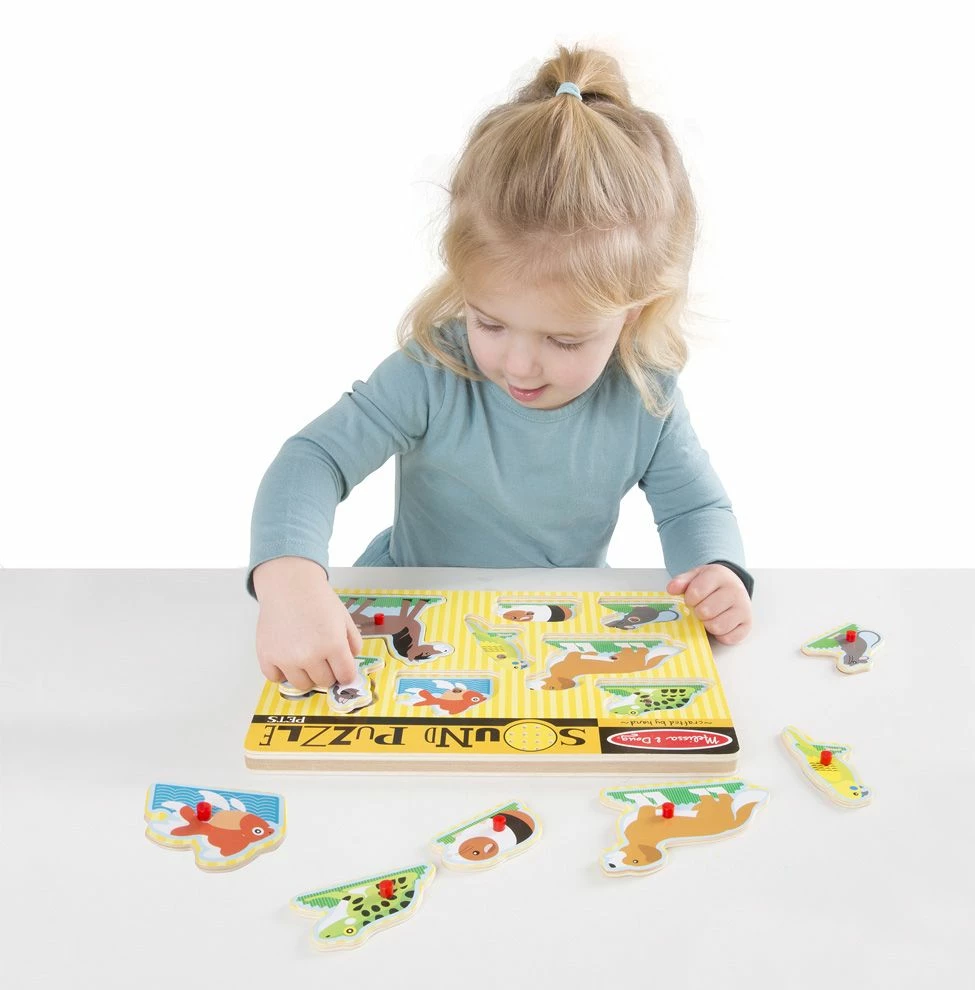 Melissa & Doug Pets Sound Puzzle – 8 Piece Some of our favorite pets are waiting to "speak" to your child. Place the puzzle piece into the well with the matching picture on the puzzle board and hear the animal meow, woof or tweet! Eye- and ear-catching puzzle enhances matching and listening skills. (TIP: Puzzle has light-activated sensors; for best results, expose the sensor by removing a piece in a brightly lit room, then make the sound play by replacing the piece in the board.)