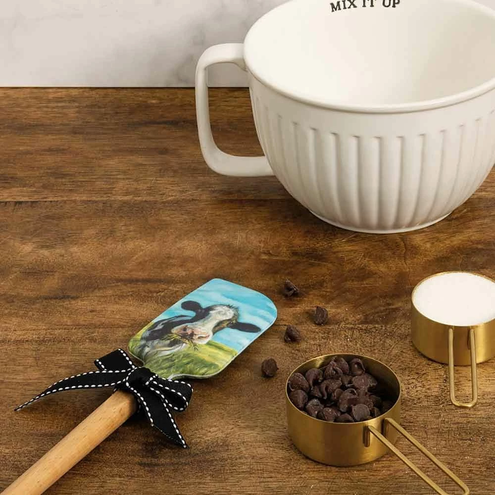 This Primitives By Kathy double-sided silicone spatula features a depiction of a cow in a field with a mouthful of grass. Logo is engraved into wooden handle for added interest and includes a decorative bow and a ribbon for hanging. Hand-wash recommended; not microwave safe.