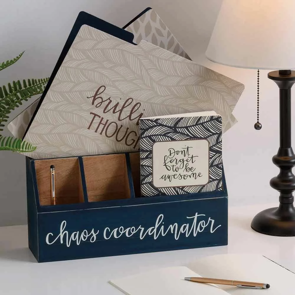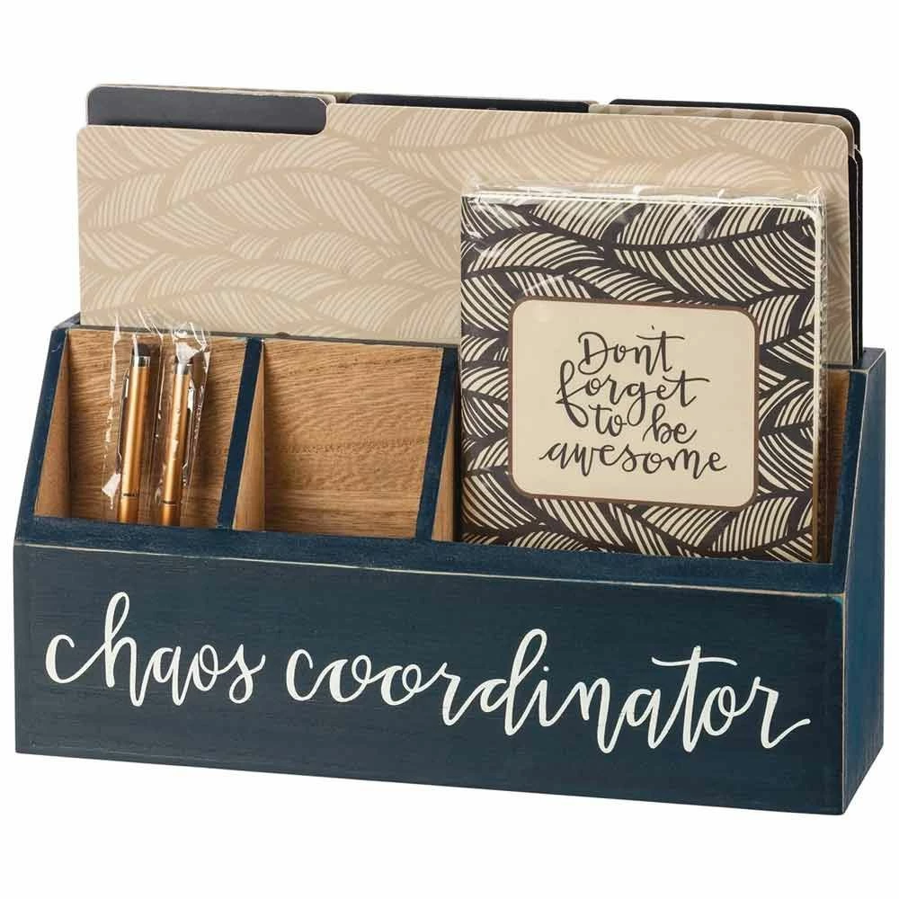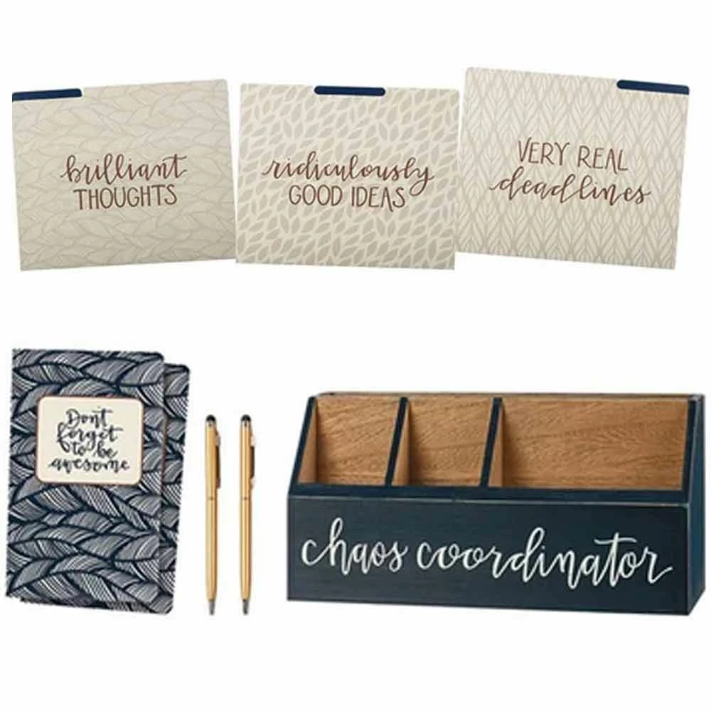 The Primitives By Kathy Chaos Coordinator Desk Set features a set of three, double-sided, tabbed letter size file folders, two large, double-sided notebooks, two pens, and a wooden desk organizer. Folders feature patterned designs with "Brilliant Thoughts," "Ridiculously Good Ideas," and "Very Real Deadlines" sentiments. Large notebooks a blue patterned palette with "Don't Forget To Be Awesome" sentiment and contain 80 lined pages. Desk organizer features a blue palette with "Chaos Coordinator" sentiment.