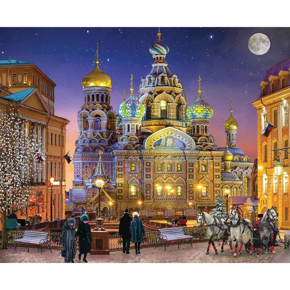 Dusk descends on a cold winter's day with this Springbok 1000 piece puzzle. Beyond the cathedral domes, a full moon appears like a jewel in the sky and by its light, a team of geldings draws a carriage home through the pearly snow.