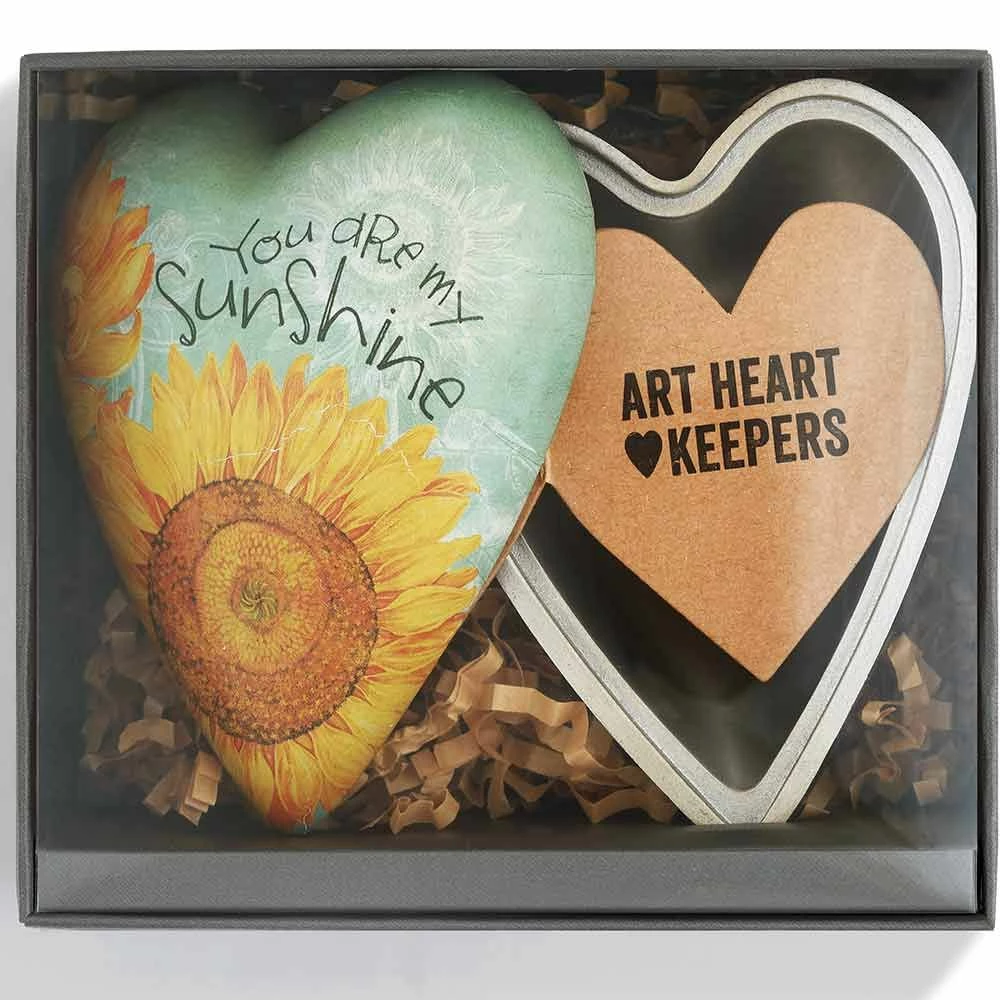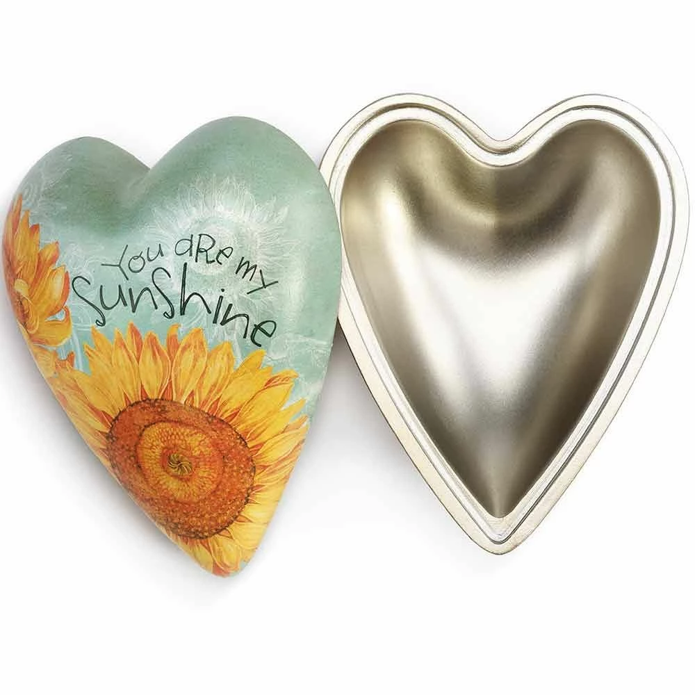 This Demdaco Sunshine Art Heart Keeper box decoratively houses nostalgic keepsakes close to the heart .Open your heart to reveal a sacred hiding space for mementos. Gold foil, gift-ready packaging shows off each heart’s unique artwork.