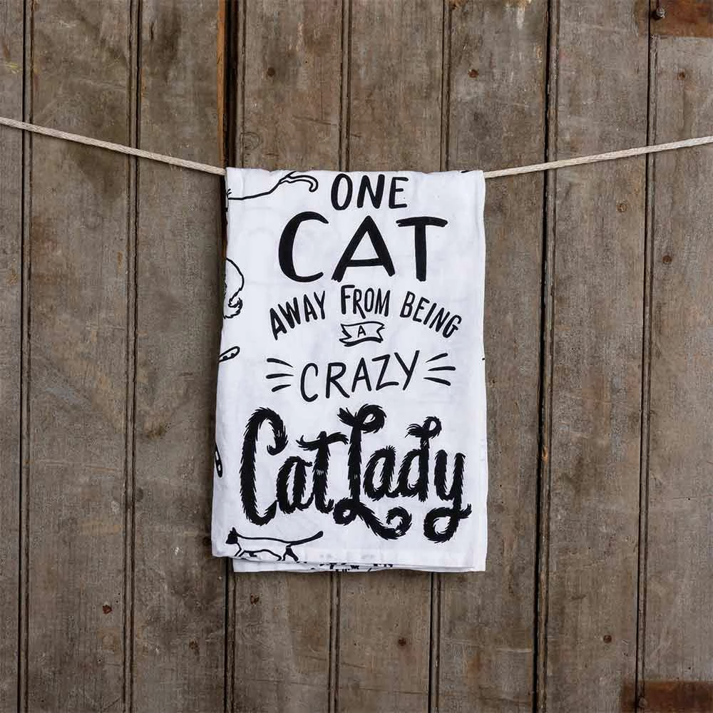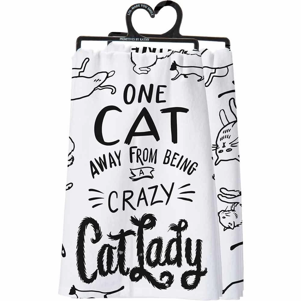 A cotton dish towel lending "One Cat Away From Being A Crazy Cat Lady" hand lettered sentiment with furry letters and cat designs throughout that complements well with existing kitchen decor. Machine-washable.