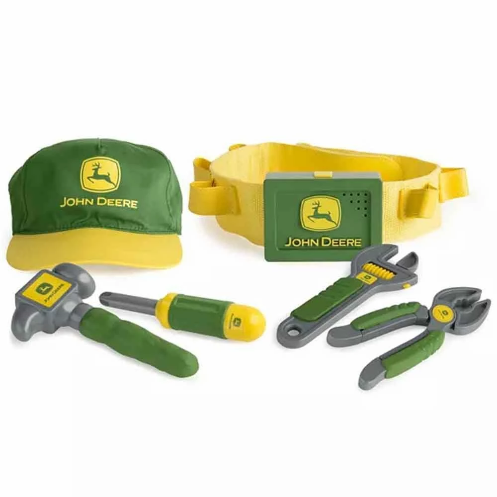 The John Deere Deluxe Talking Tool Belt is the perfect toy tool set for your little fixer-upper! This 6 piece set includes tool belt, hat, hammer, wrench, screwdriver, and pliers to get the job done. The tool belt plays 5 sounds.