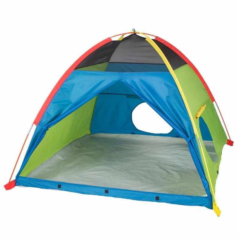Come one! Come all! There's room for everyone in Pacific Play Tents® Super Duper 4 Kid Dome Tent! Made of high quality Polyester Taffeta and G3 Safety-Coated this durable tent stands at 58 x 58 x 46 in. to accommodate both children and adults alike whether you play inside or outside. The Super Duper 4 Kid Dome Tent features a waterproof floor for easy clean-up color-coated poles and reinforced pole pockets for fast assembly and double stitched seams along stress points for reinforcement. It also includes No-See-Um Mesh to allow for ventilation while keeping bugs at bay and two tunnel ports with roll-up flaps and hook and loop fasteners that can be connected to your favorite Pacific Play Tents tunnels. The tighter weave creates better protection from bugs and mosquitoes. No glare for visibility. Once playtime is over simply tuck the tent into it's sturdy carry bag for convenient travel and storage. Everyone is sure to feel welcome in the Super Duper 4 Kids Dome Tent!