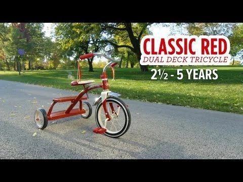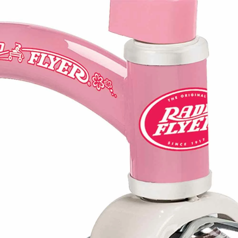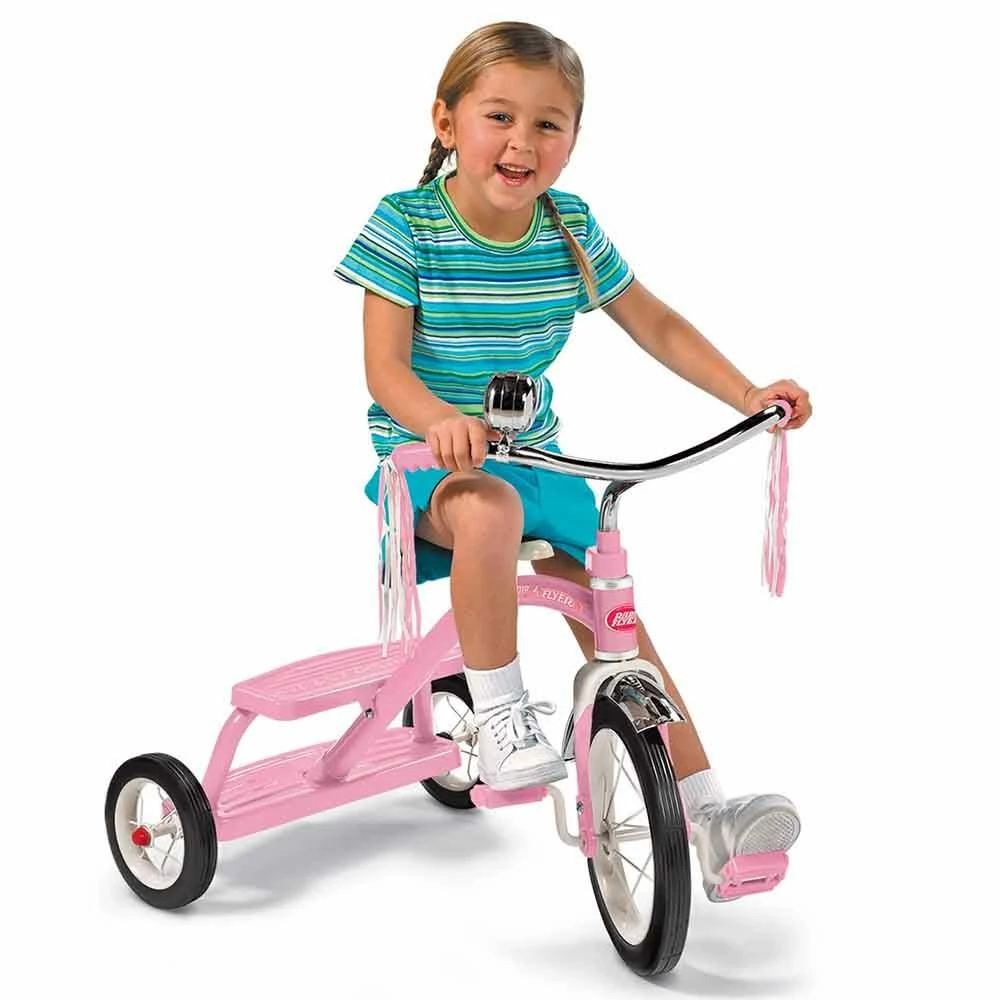 Radio Flyer Classic Pink Dual Deck Tricycle™ is a timeless icon of childhood, from the chrome handlebars and fender to the playful streamers and deluxe ringing bell. This classic tricycle features sturdy 12 in. spoked wheels and real rubber tires for enhanced durability. The steel frame and chrome accents add to the premium look and quality design. This tricycle can withstand the test of time for years of fun and memory making. The adjustable seat on the Classic Pink Dual Deck Tricycle™ grows with your child to ensure years of fun play. Watch your child develop from rookie rider to tricycle expert as they practice and grow.