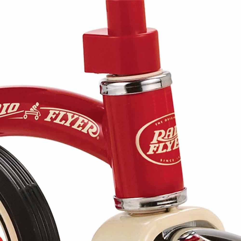 Radio Flyer Classic Red Dual Deck Tricycle™ is a timeless icon of childhood, from the chrome handlebars and fender to the playful streamers and deluxe ringing bell. This classic tricycle features sturdy 12 in. spoked wheels and real rubber tires for enhanced durability. The steel frame and chrome accents add to the premium look and quality design. This tricycle can withstand the test of time for years of fun and memory making. The adjustable seat on the Classic Red Dual Deck Tricycle™ grows with your child to ensure years of fun play. Watch your child develop from rookie rider to tricycle expert as they practice and grow.