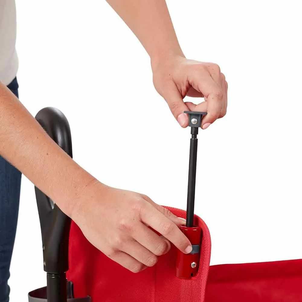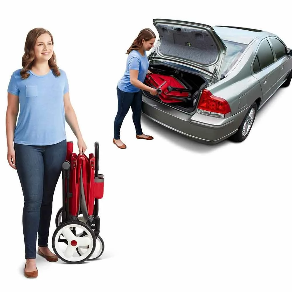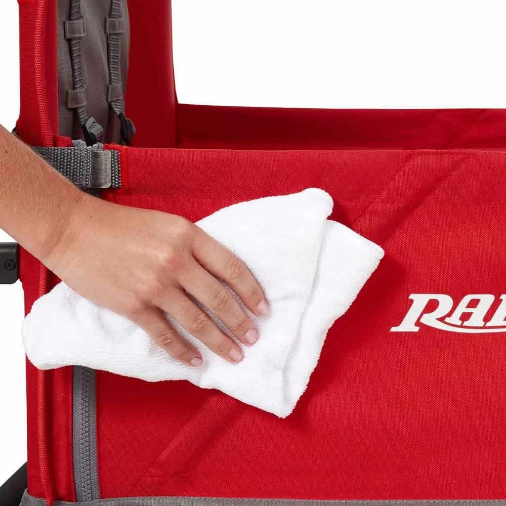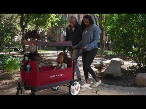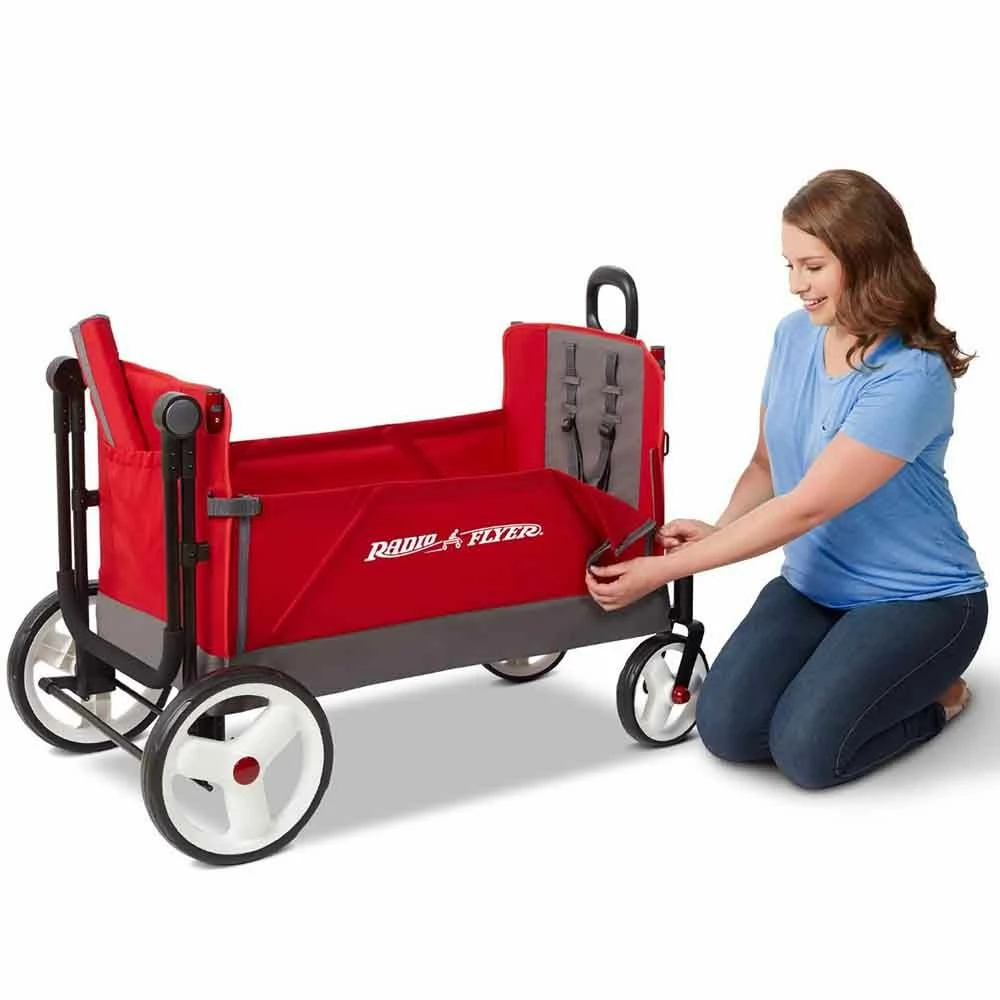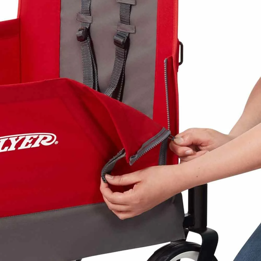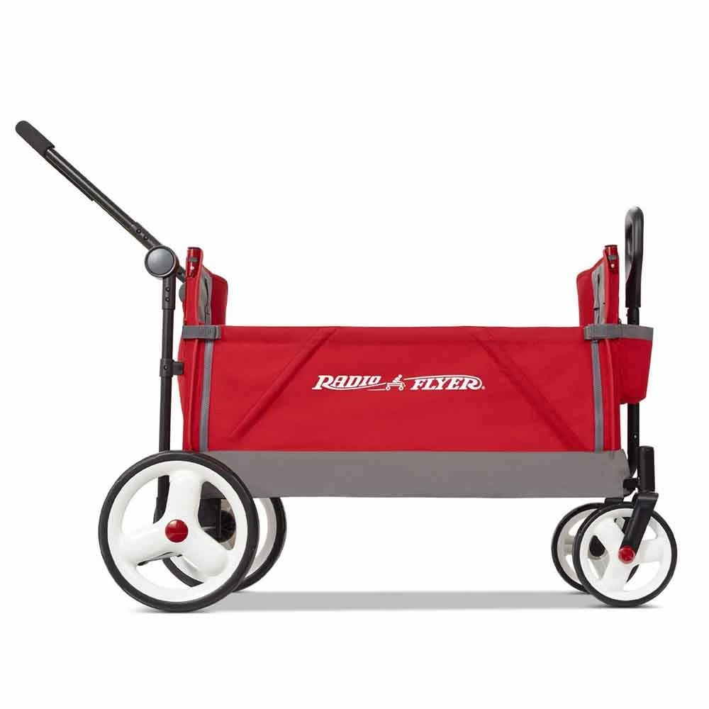 Radio Flyer Convertible Stroller Wagon is designed with thoughtful features for both parents and kids. Equipped with cup holders, a roll-up UV protection canopy, and an adjustable height push handle, this folding stroller wagon is ideal for the whole family, including the dog! It also features DuraClean® 2.0, our highest quality fabric, which is extremely durable and easy to clean. This premium vehicle fully converts from a stroller to a push and pull wagon thanks to a unique design that allows the optimal steering configuration for each mode: a traditional wagon pull handle in the front and a fold-away stroller handlebar on the back. Large 12 in. rear wheels allow for easy push pull functionality and provide a smooth ride. The Convertible Stroller Wagon passes both Toy and Stroller Safety Standards. Features like two 5-point safety harnesses and rear brake keep babies as young as 12 months secure and comfortable. With three different seating modes and an easy one hand fold, this double stroller wagon is ready to go when you are, no matter the occasion. Push or pull little riders on a walk around the neighborhood, convert to bench seating for a picnic in the park, or haul home all of your farmers market finds. The Convertible Stroller Wagon can do it all.