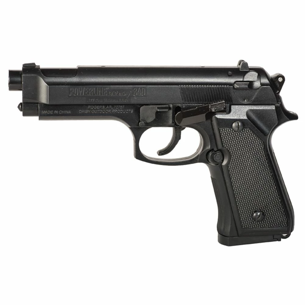 Daisy® PowerLine Model 340 BB Pistol is a spring-air pistol that features a 200-shot BB reservoir with a 13-shot Speedload Clip. The removable Speedload Clip is located in the grip. Once the reservoir is loaded with 200 BBs, you just pull the Speedload Clip tab all the way out, shake the pistol and push the tab back in to reload the Speedload Clip without removing the magazine. (See ownerís manual for detailed instruction.) For hours of fun on the range and basic training for pistol shooters, Daisyís PowerLine Model 340 pistol is appropriate for adults and those ages 16 and older with adult supervision.