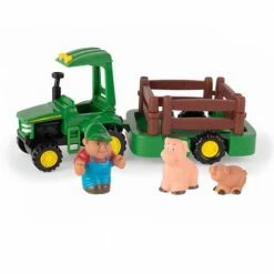 John Deere 1st Farming Fun Hauler Set includes tractor, trailer, farmer, 2 pigs, and 4 pieces of fence. Removable fence works on or off the trailer.