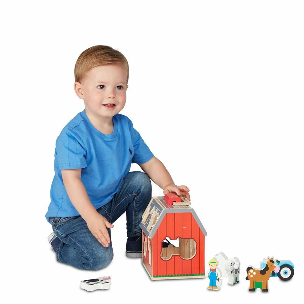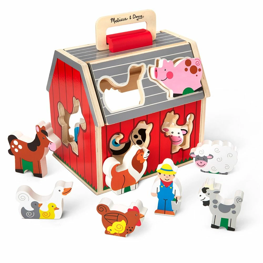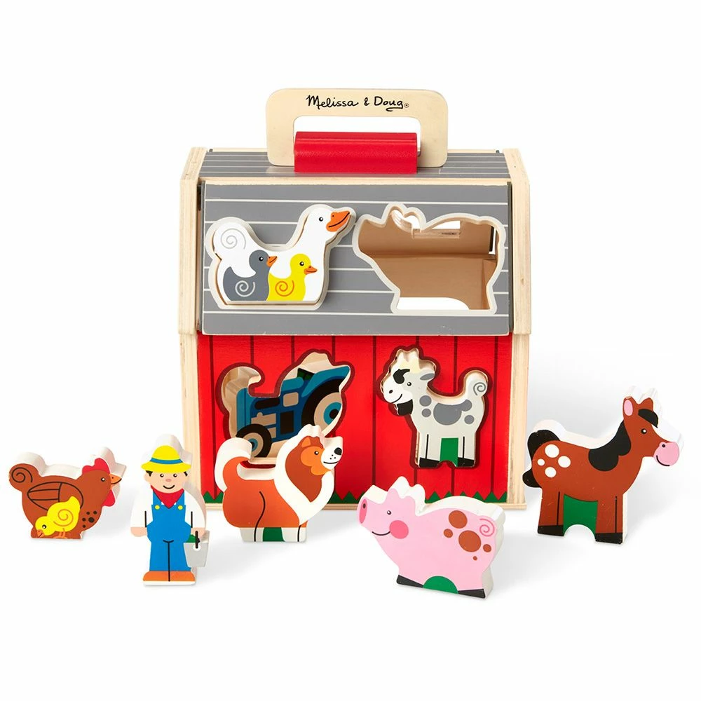 Kids can take farm animal fun wherever they go with the Melissa & Doug Take-Along Sorting Barn! Fit the 10 wooden play pieces into shaped holes in the sturdy wooden barn, or stand the pieces up for pretend play. Flip up the barn roof for quick and easy access, and use the handle to take playtime anywhere. A perfect gift for toddlers and preschoolers two and older, the chunky pieces (ducks, horse, pig, goat, sheep, chicken, dog, cow, tractor, and farmer) are easy for little hands to grasp and maneuver, and help promote fine motor skills, matching and sorting, and creative play.