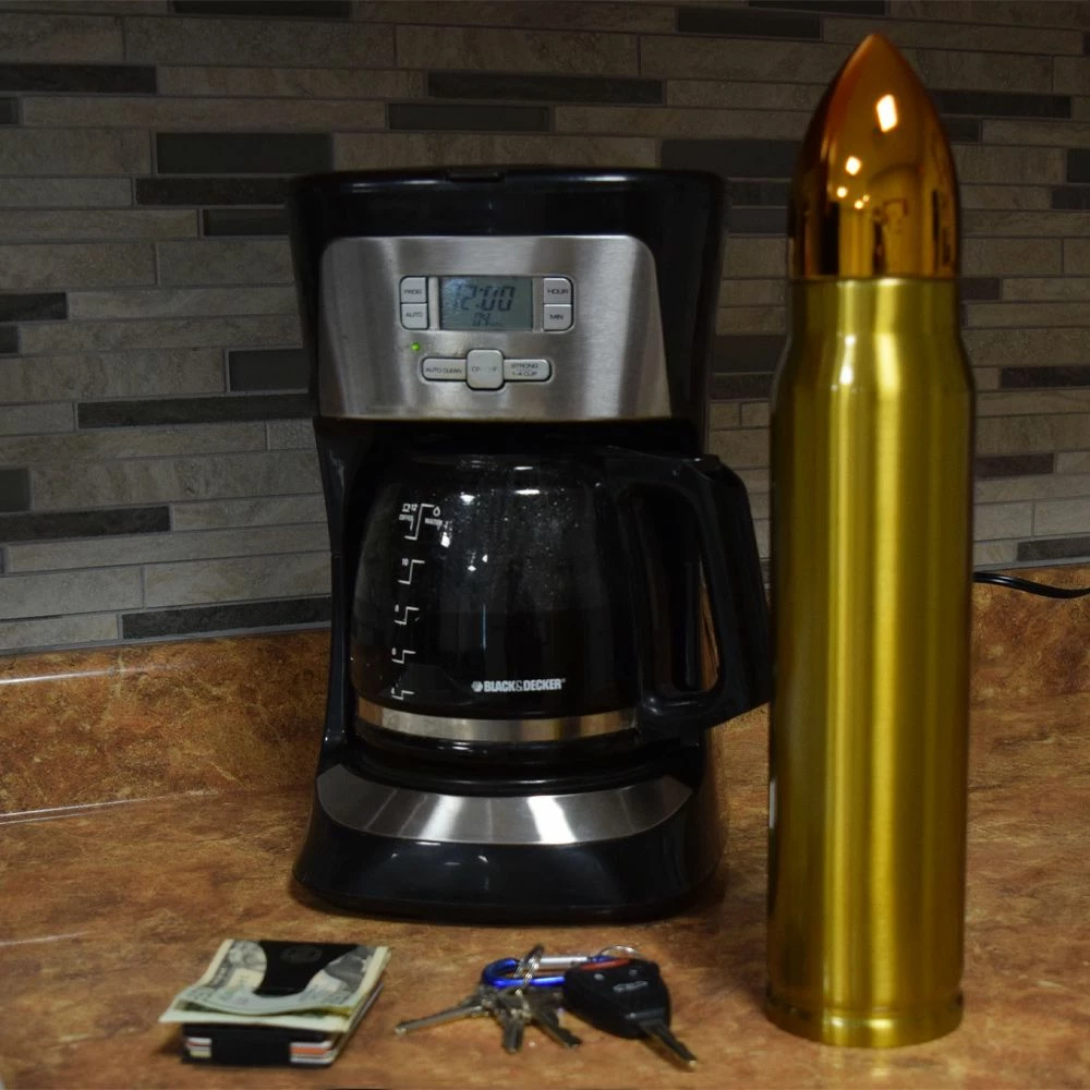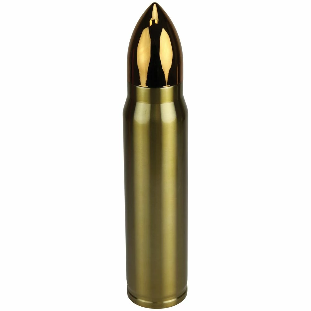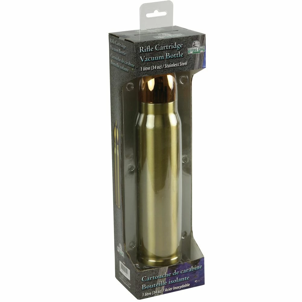 Keep your beverage of choice warm or cool with this River's Edge Products vacuum insulated bottle. Designed to look exactly like a rifle cartridge. Capacity is 1 liter (32oz) with screw on drinking cup on top and no spill push button pour top. Double wall stainless steel construction to ensure a steady temperature of the liquid inside.
