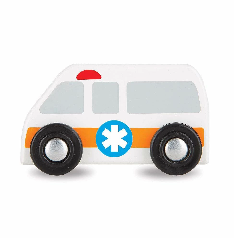 | Components and Accessories Included | Includes 4 colorful wooden rescue vehicles: ambulance, fire truck, helicopter, and police car, woven rug |